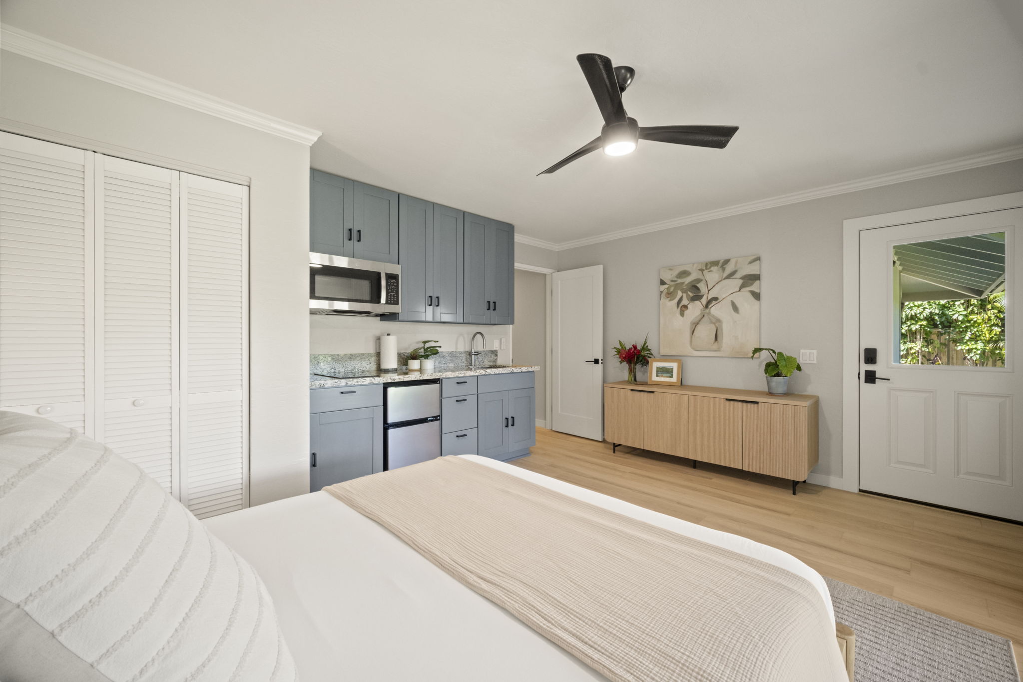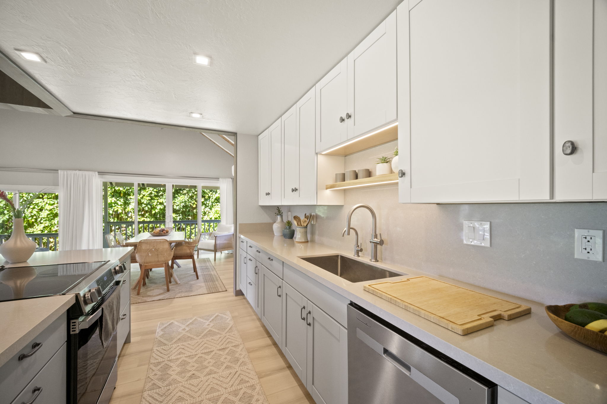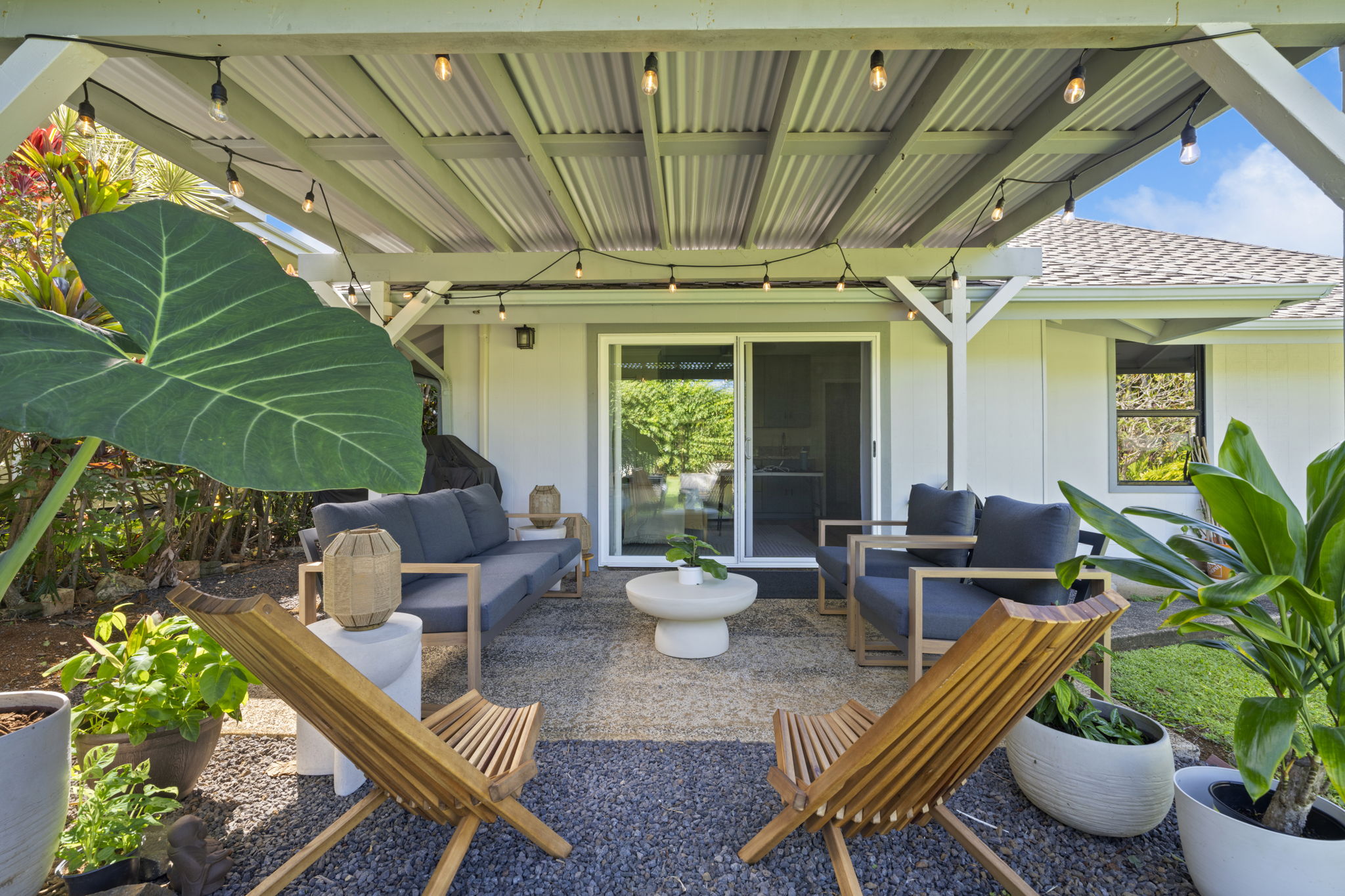 Outdoors, your large private backyard oasis awaits — complete with a custom hot and cold surfboard shower, lush landscaping, and covered lanai to enjoy the mountain ridgeline views. The outdoor space is the perfect spot to enjoy a meal, soak up the sun, or simply relax in the island breeze.