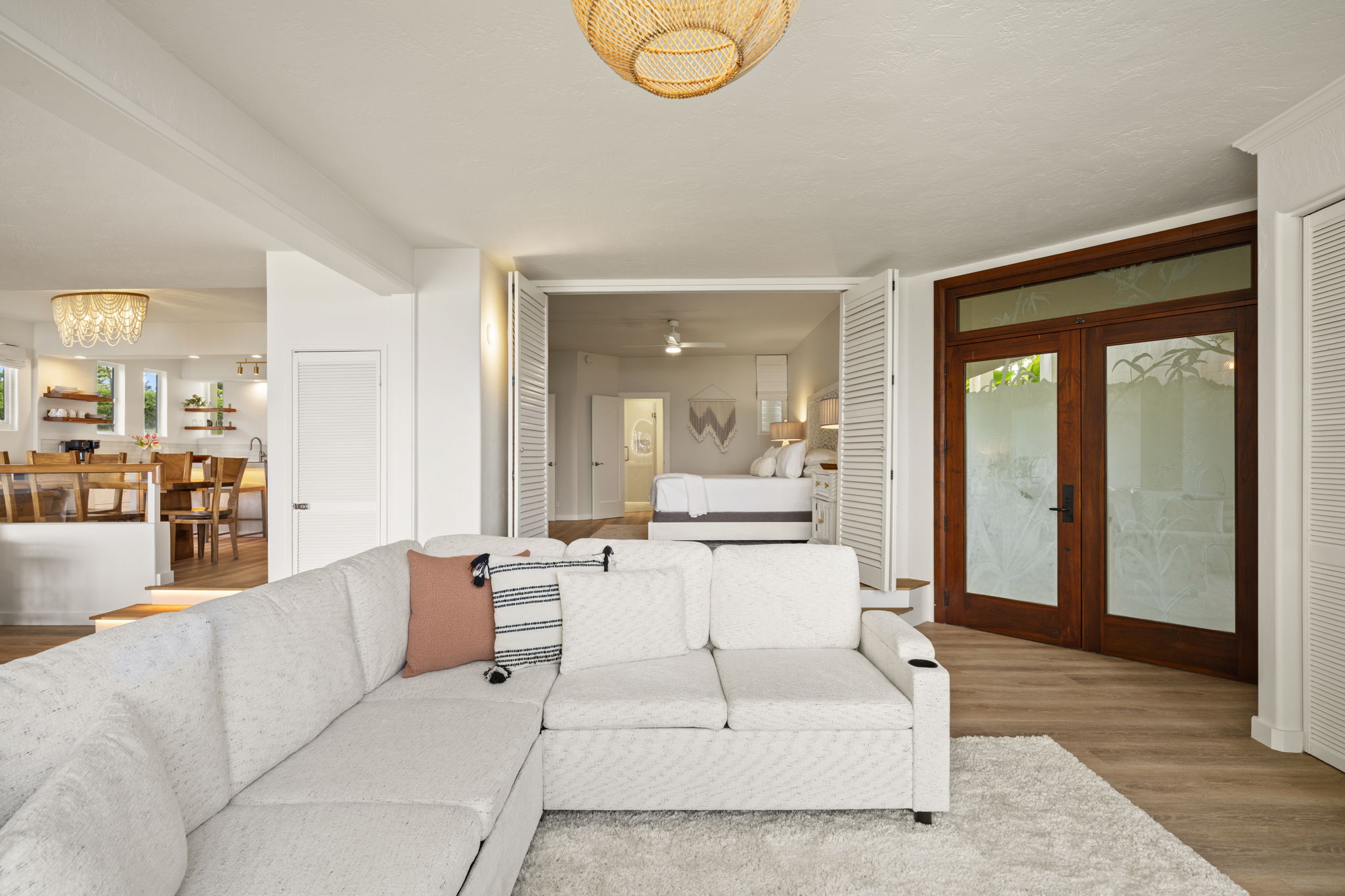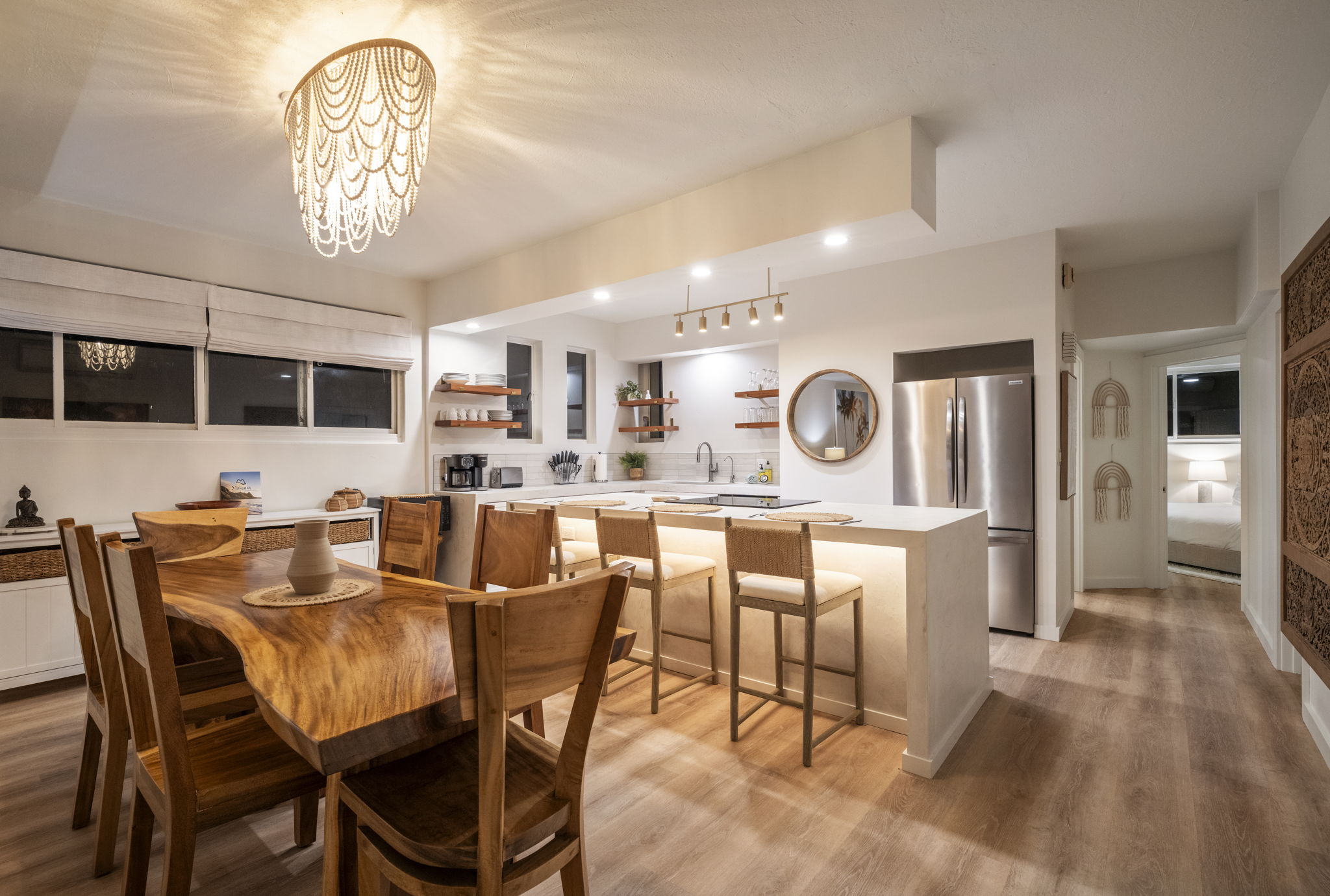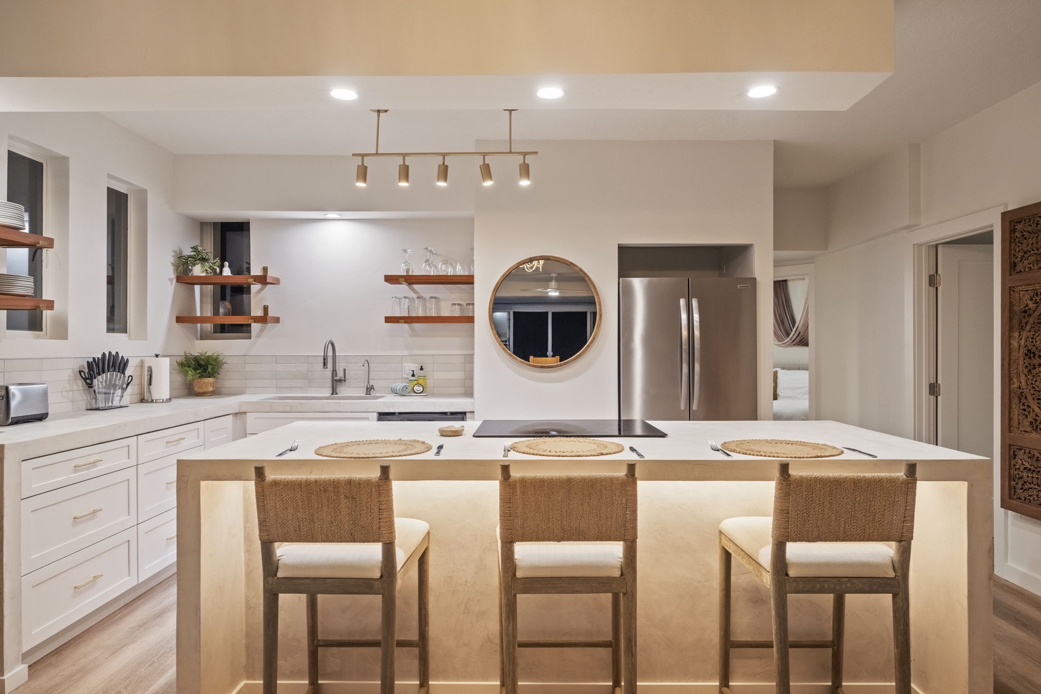 With 2 spacious bedrooms — both featuring Cal King beds with luxurious linens — and 2 spa-style bathrooms with walk-in showers and a soaking tub, Mahina Kai is designed for indulgence. At 2,200 sq. ft., it is one of the largest residences in the Pu’u Poa community, with soaring ceilings and a seamless open-concept design. A state-of-the-art gourmet kitchen with brand-new appliances and a grand dining area make hosting effortless and memorable.