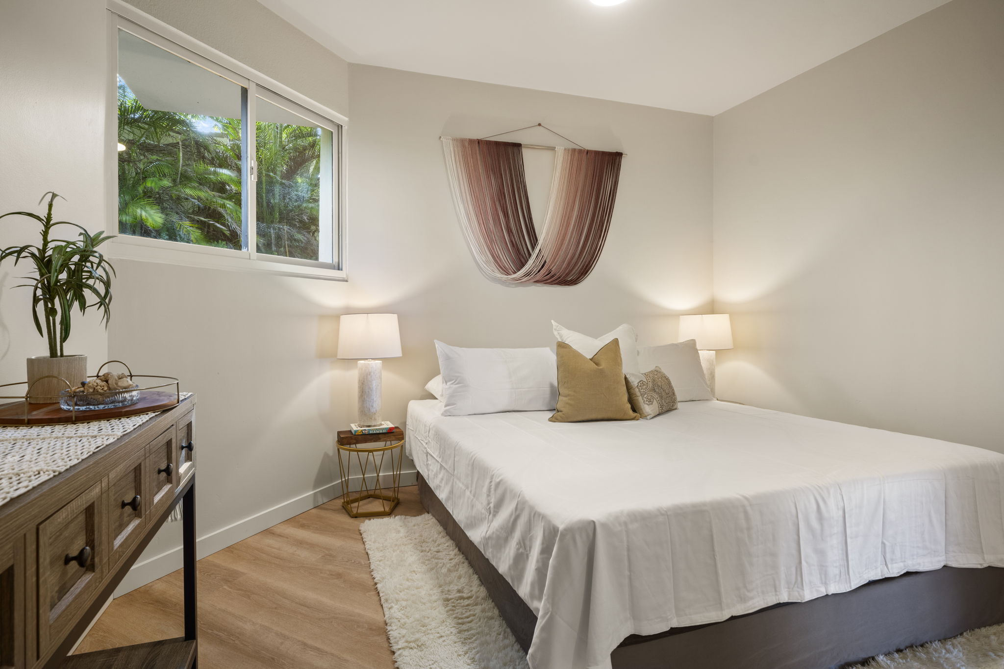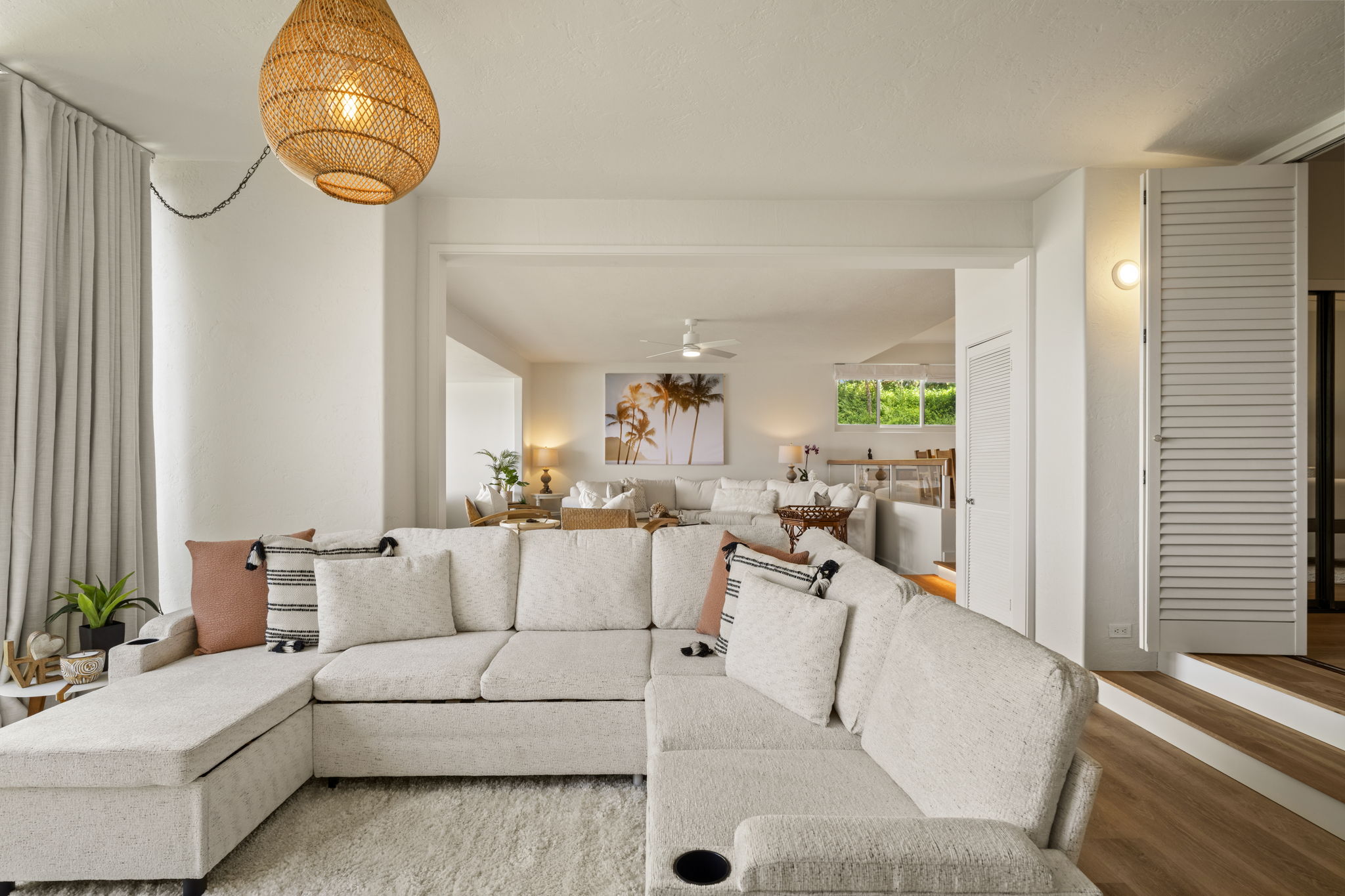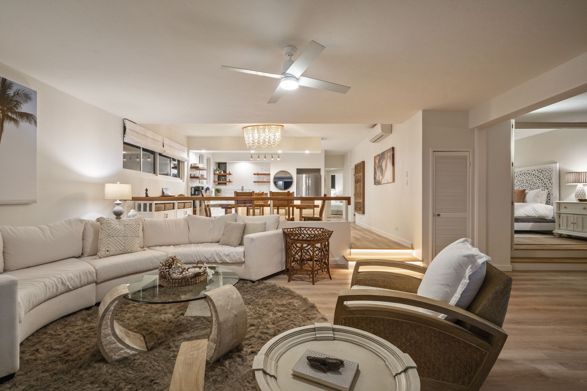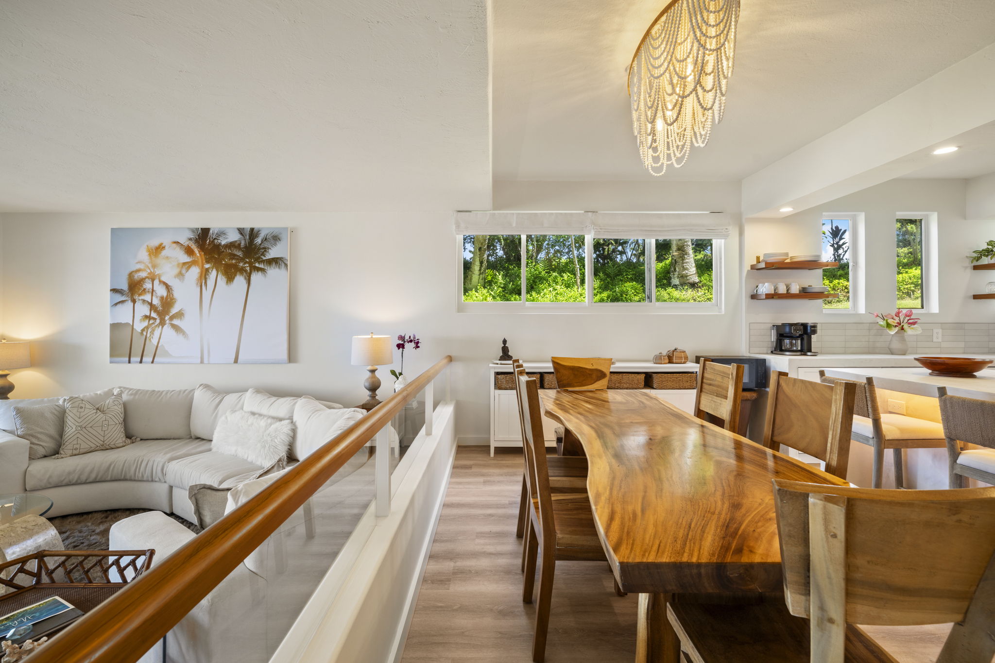 With 2 spacious bedrooms — both featuring Cal King beds with luxurious linens — and 2 spa-style bathrooms with walk-in showers and a soaking tub, Mahina Kai is designed for indulgence. At 2,200 sq. ft., it is one of the largest residences in the Pu’u Poa community, with soaring ceilings and a seamless open-concept design. A state-of-the-art gourmet kitchen with brand-new appliances and a grand dining area make hosting effortless and memorable.