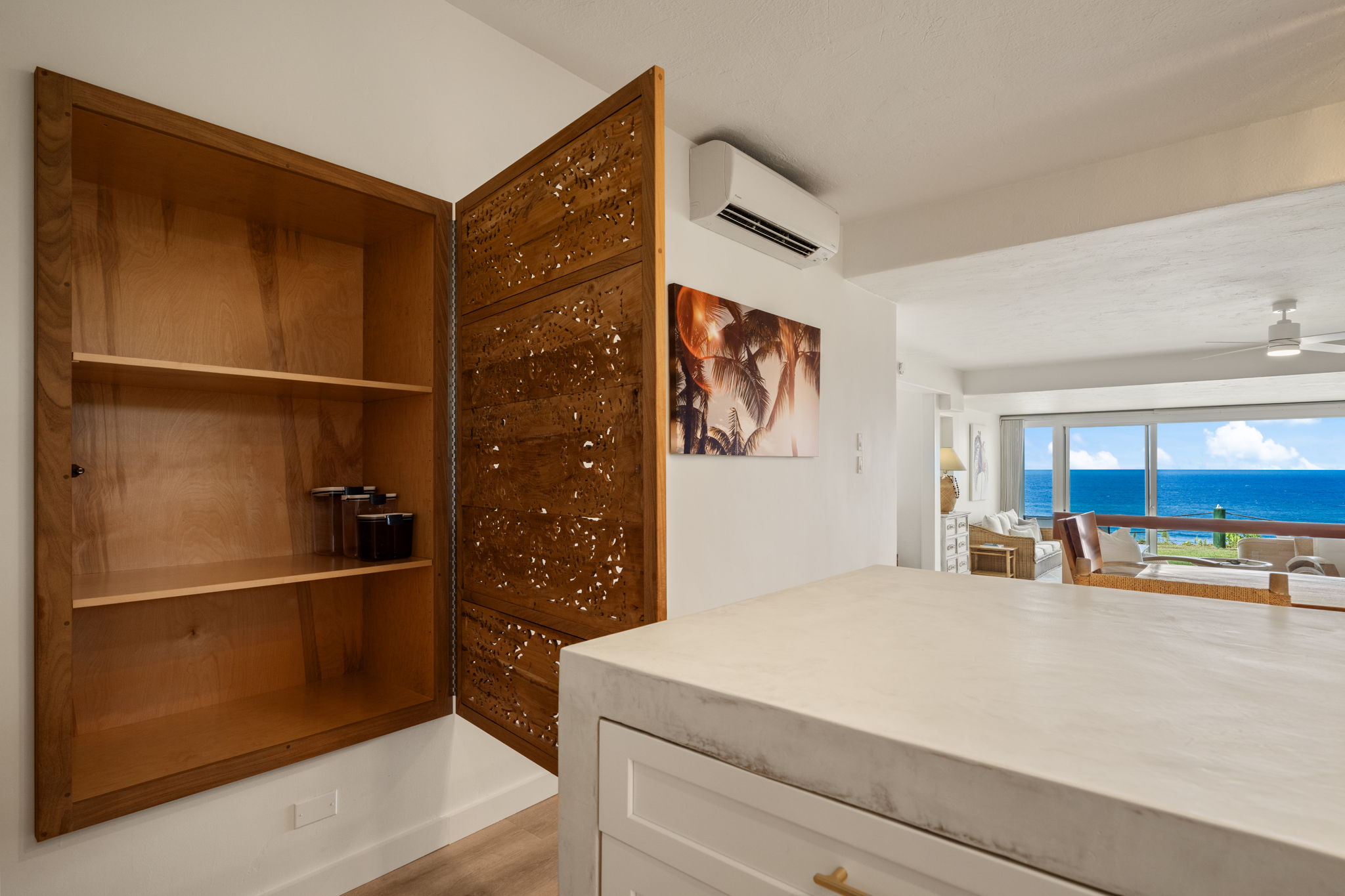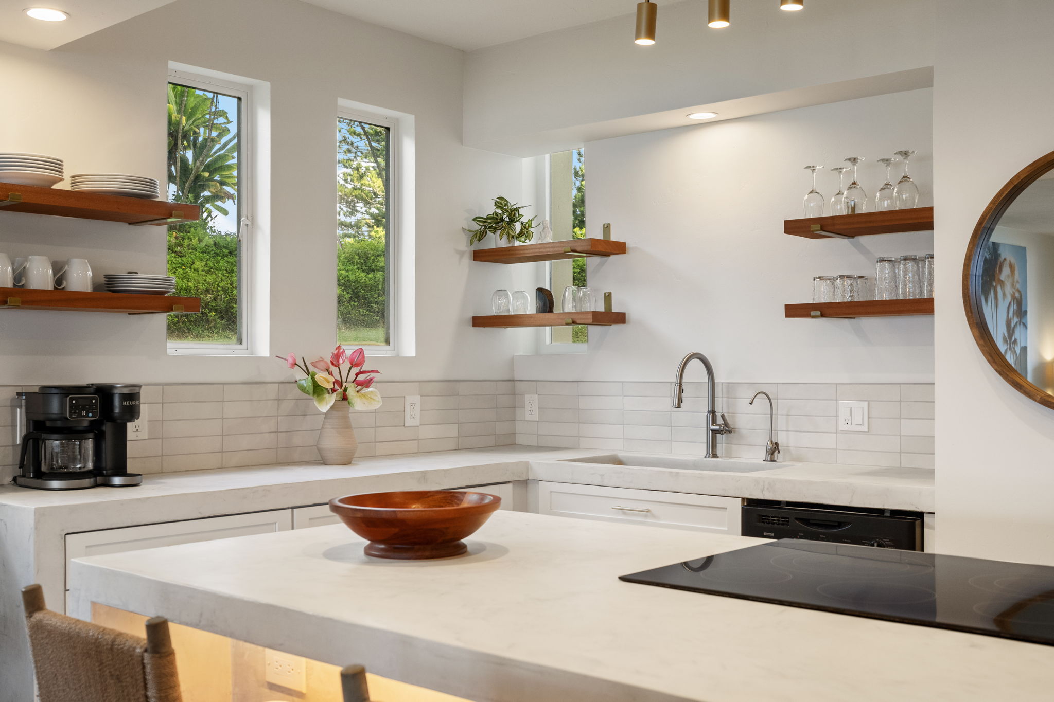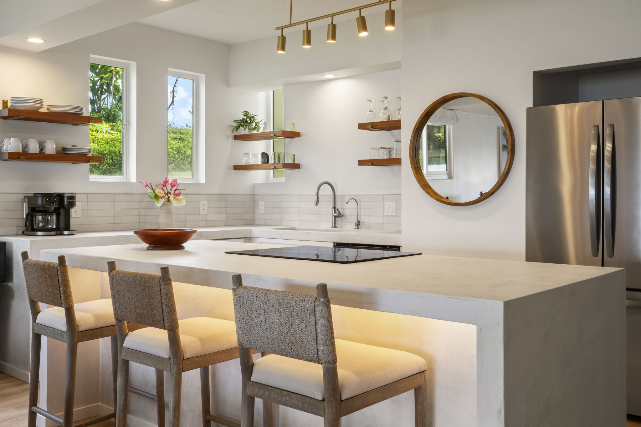 Custom counters and artisan details reflect the craftsmanship of local Kauai makers. Balinese pantry panels were hand-sourced and installed by a local carpenter, bringing global elegance into island living. Local fine art photography adorns the walls, showcasing Kauai’s natural beauty through the lens of a celebrated island photographer. This level of detail creates a space that feels at once luxurious, soulful, and deeply connected to place.