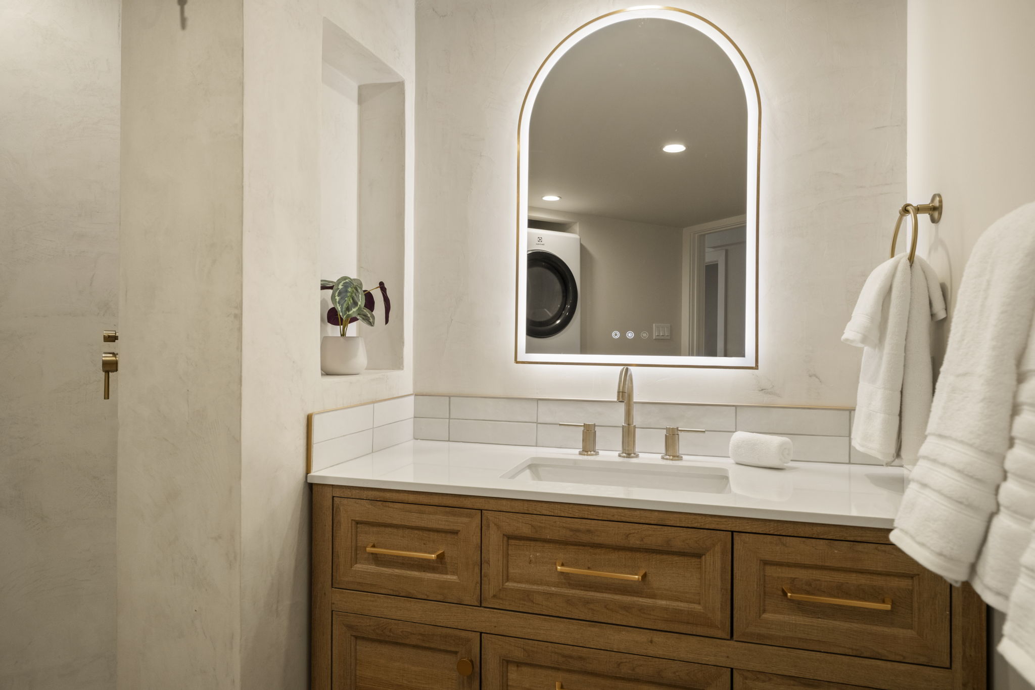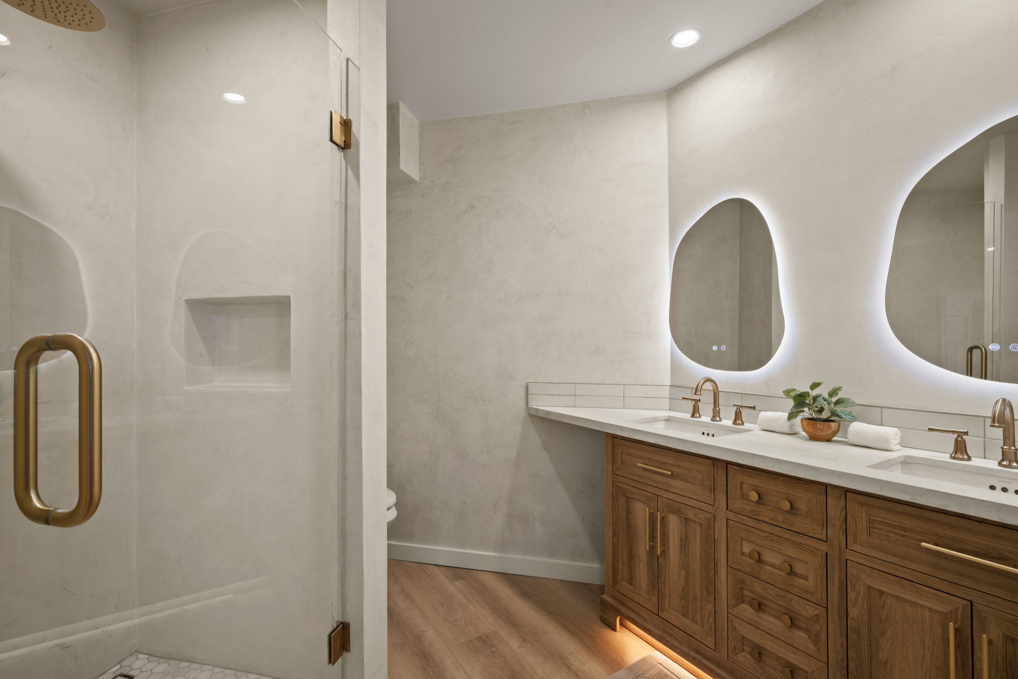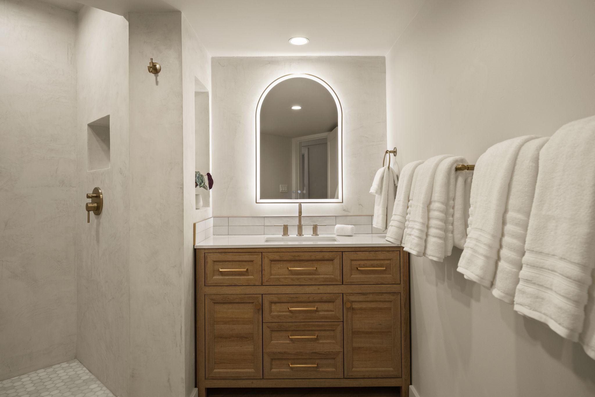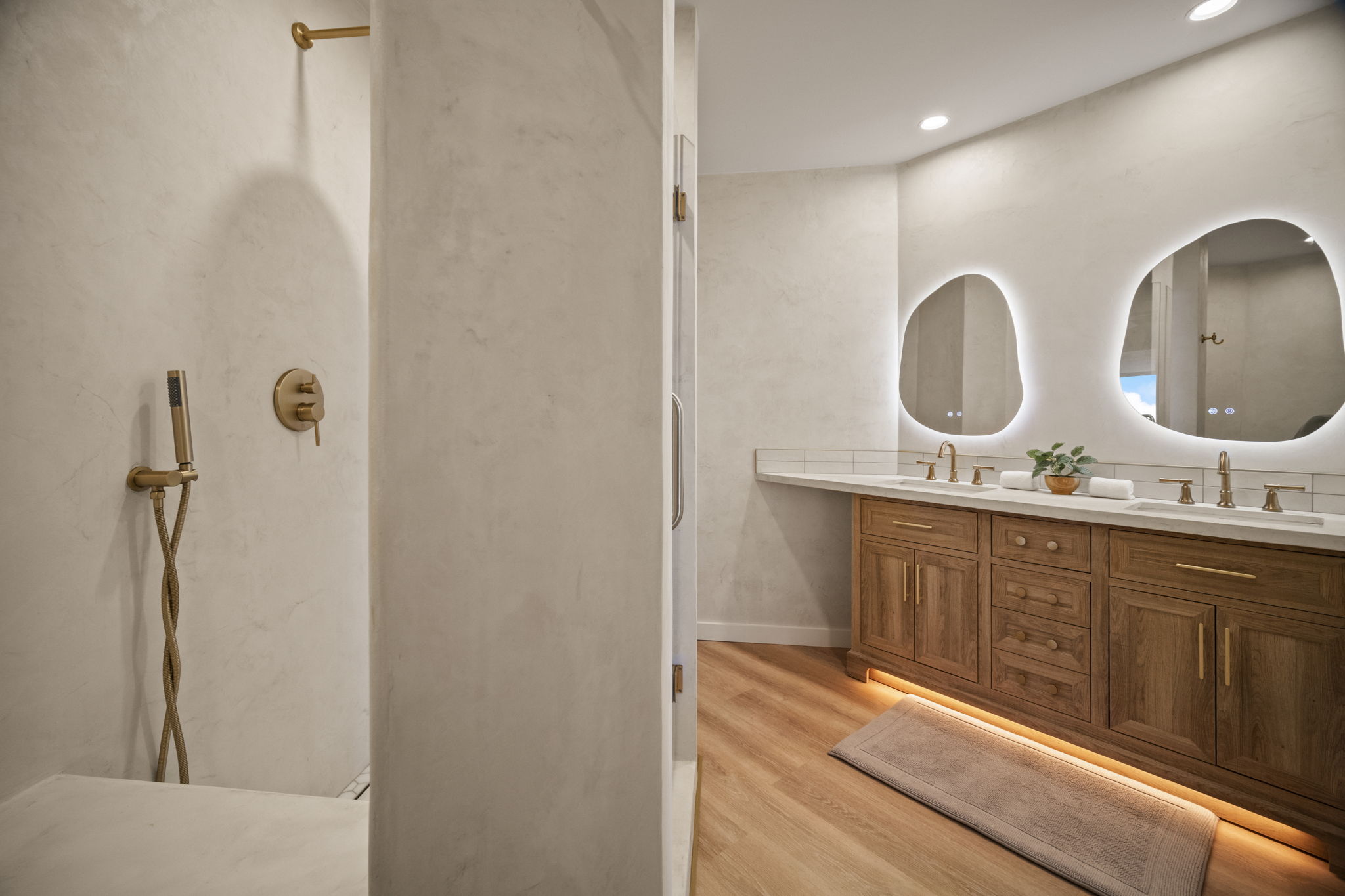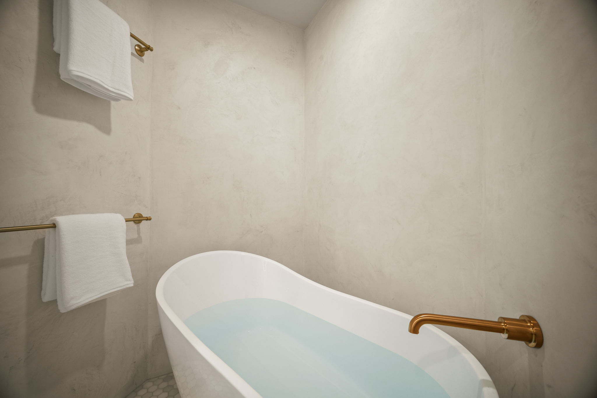 Spa-inspired bathrooms feature hand-painted microcrete finishes, evoking the feel of a private retreat.