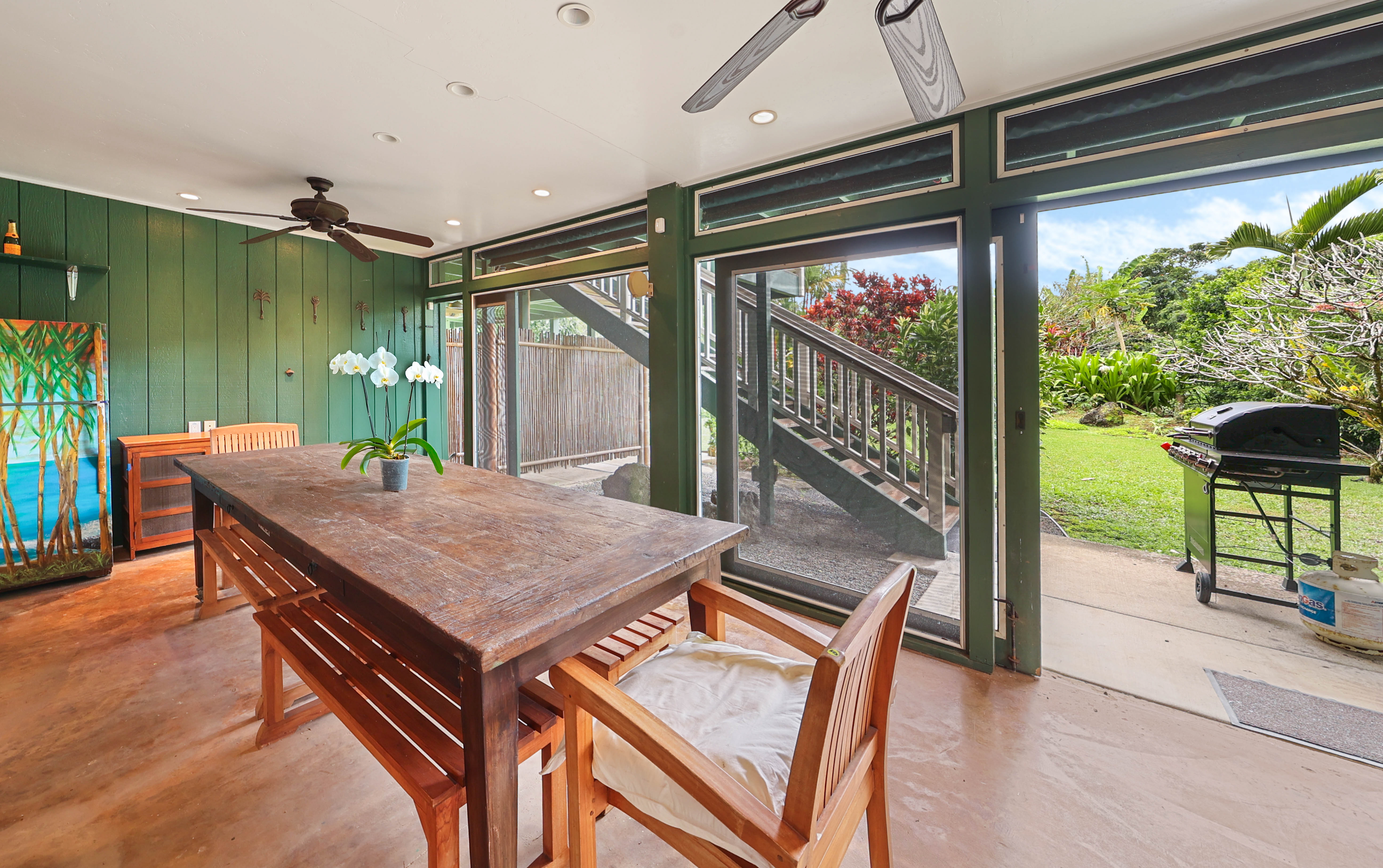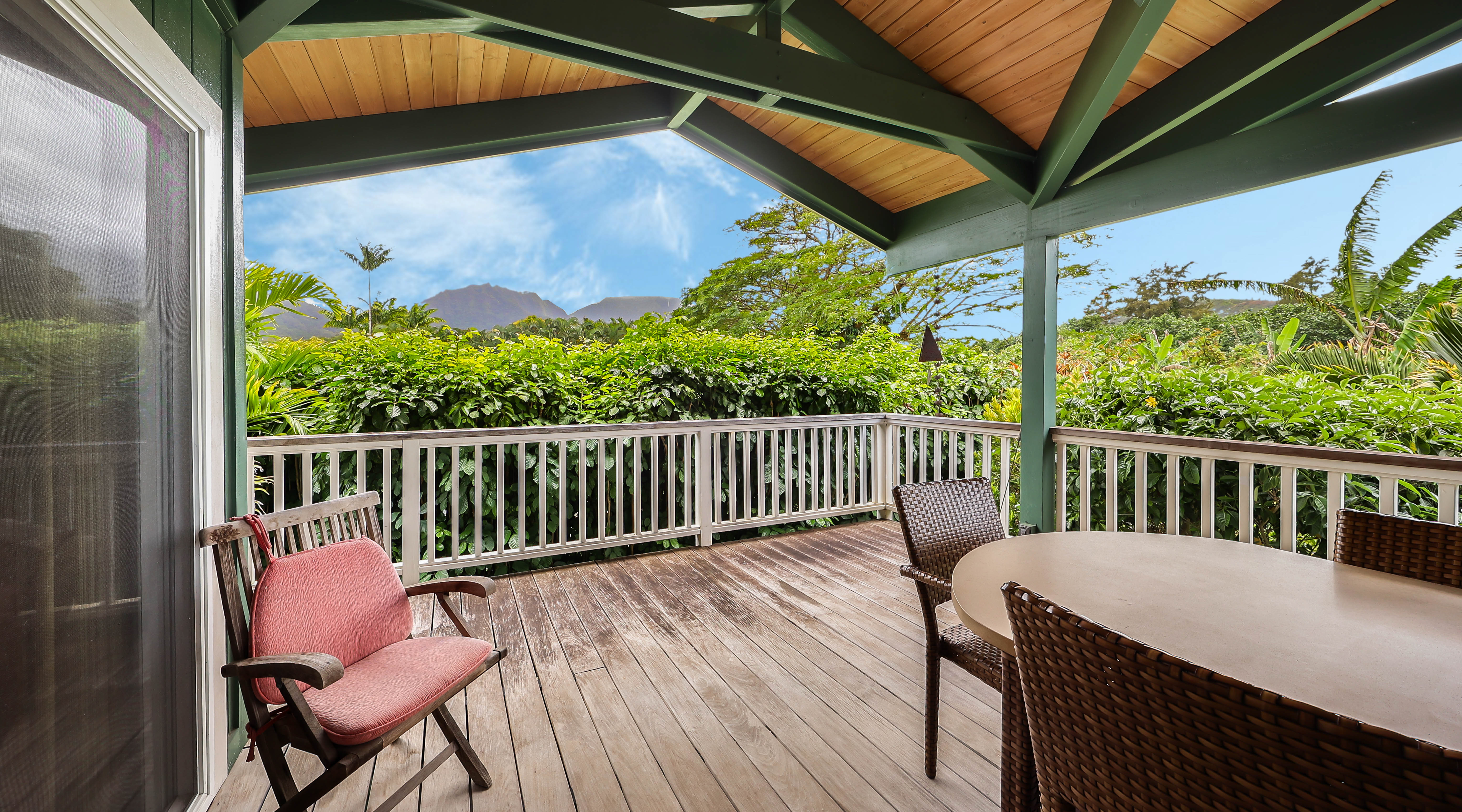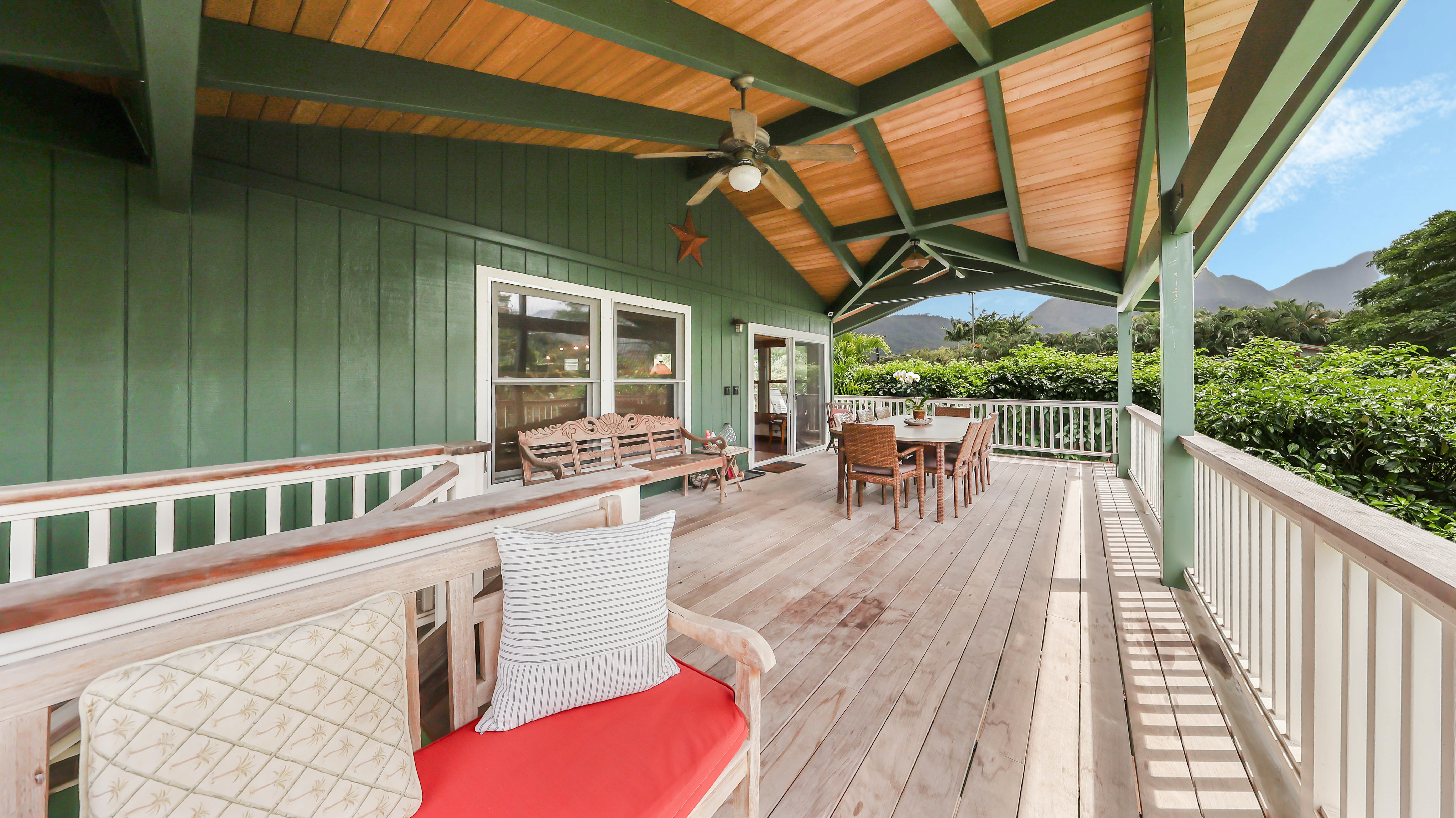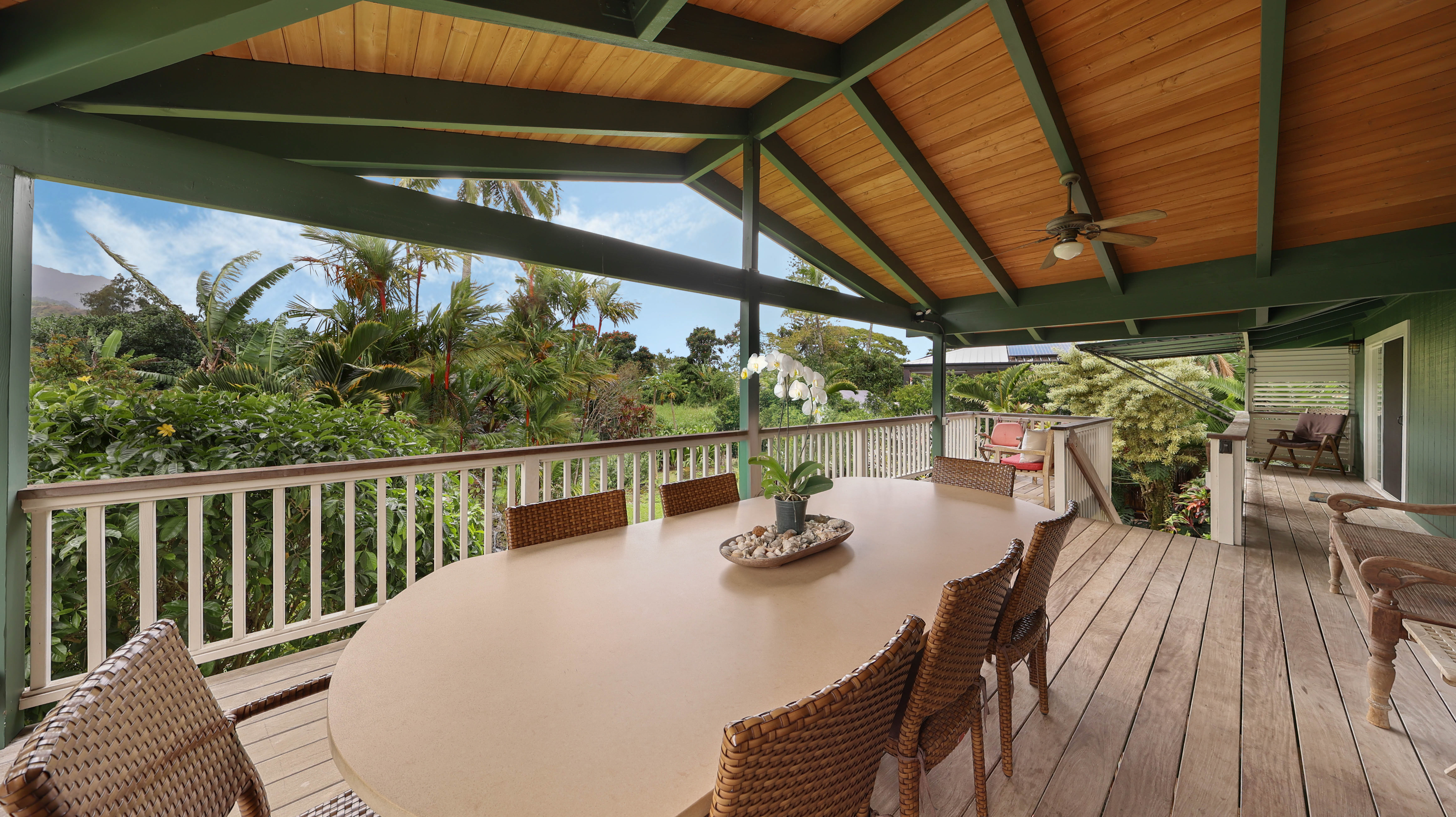 Spend your mornings enjoying coffee or a good book on the covered lanai, complete with an oversized dining table, comfortable benches, chairs, and lounge seating. On Saturdays, take a short stroll to the nearby Hanalei Farmers Market for fresh local produce and island treats.