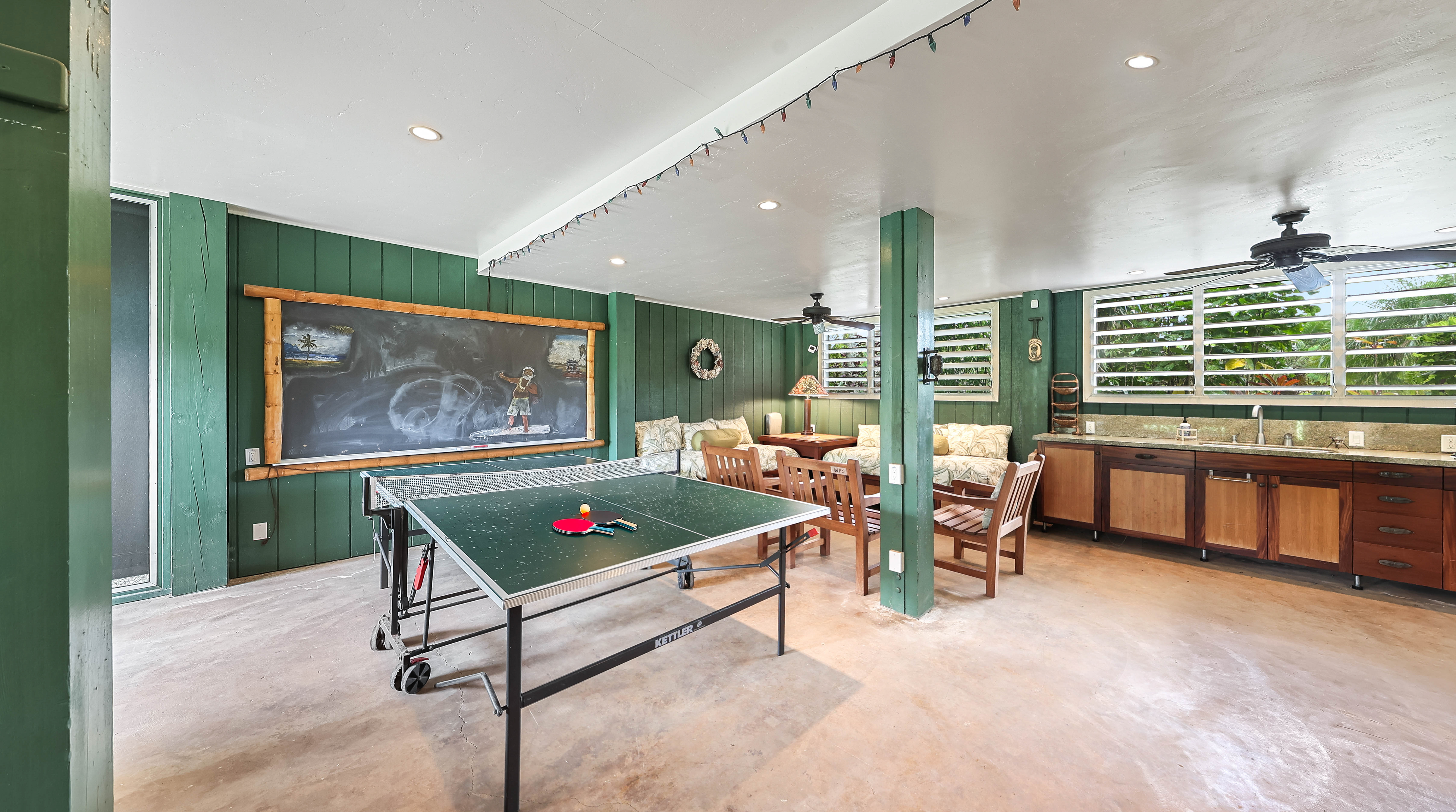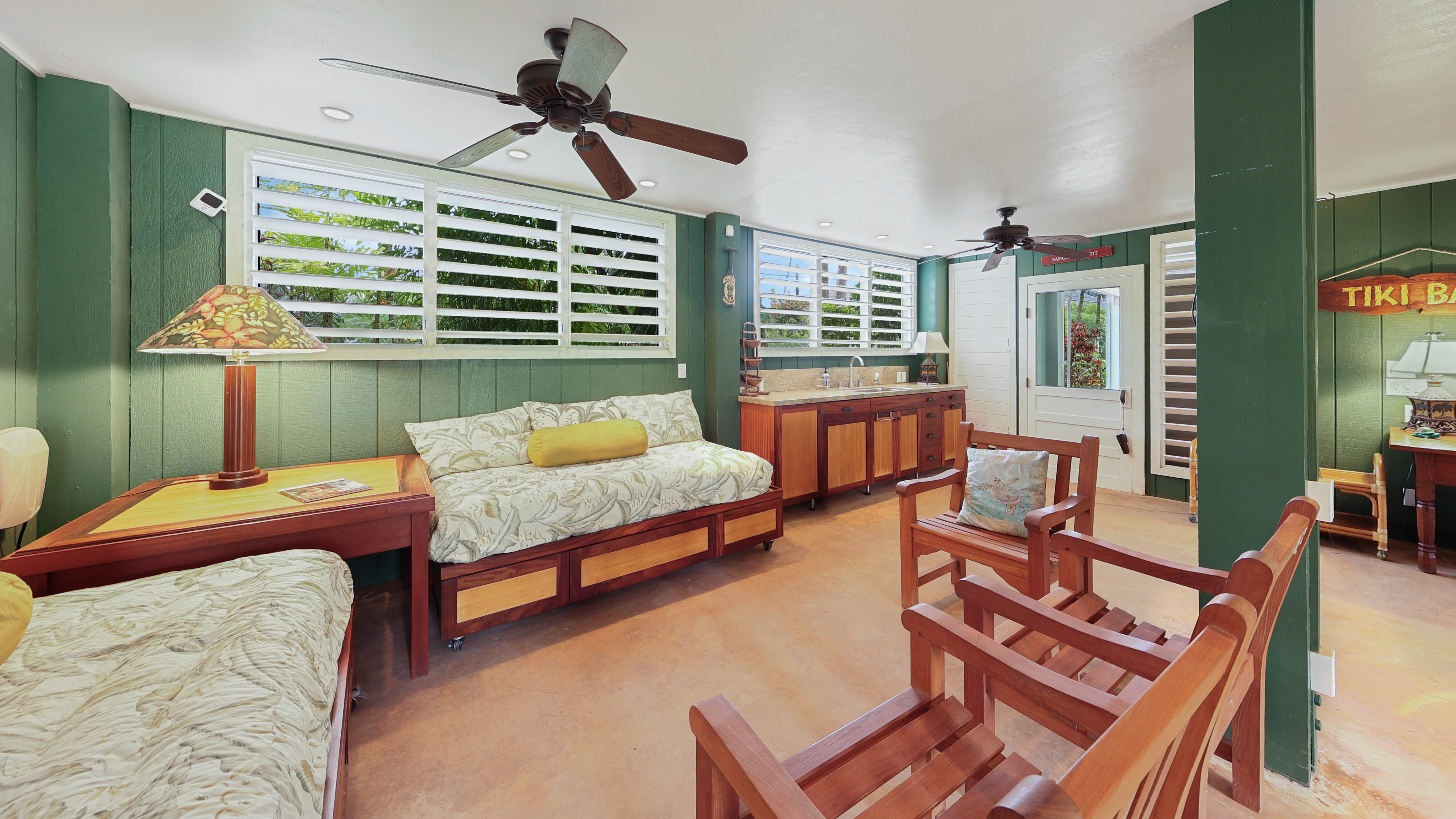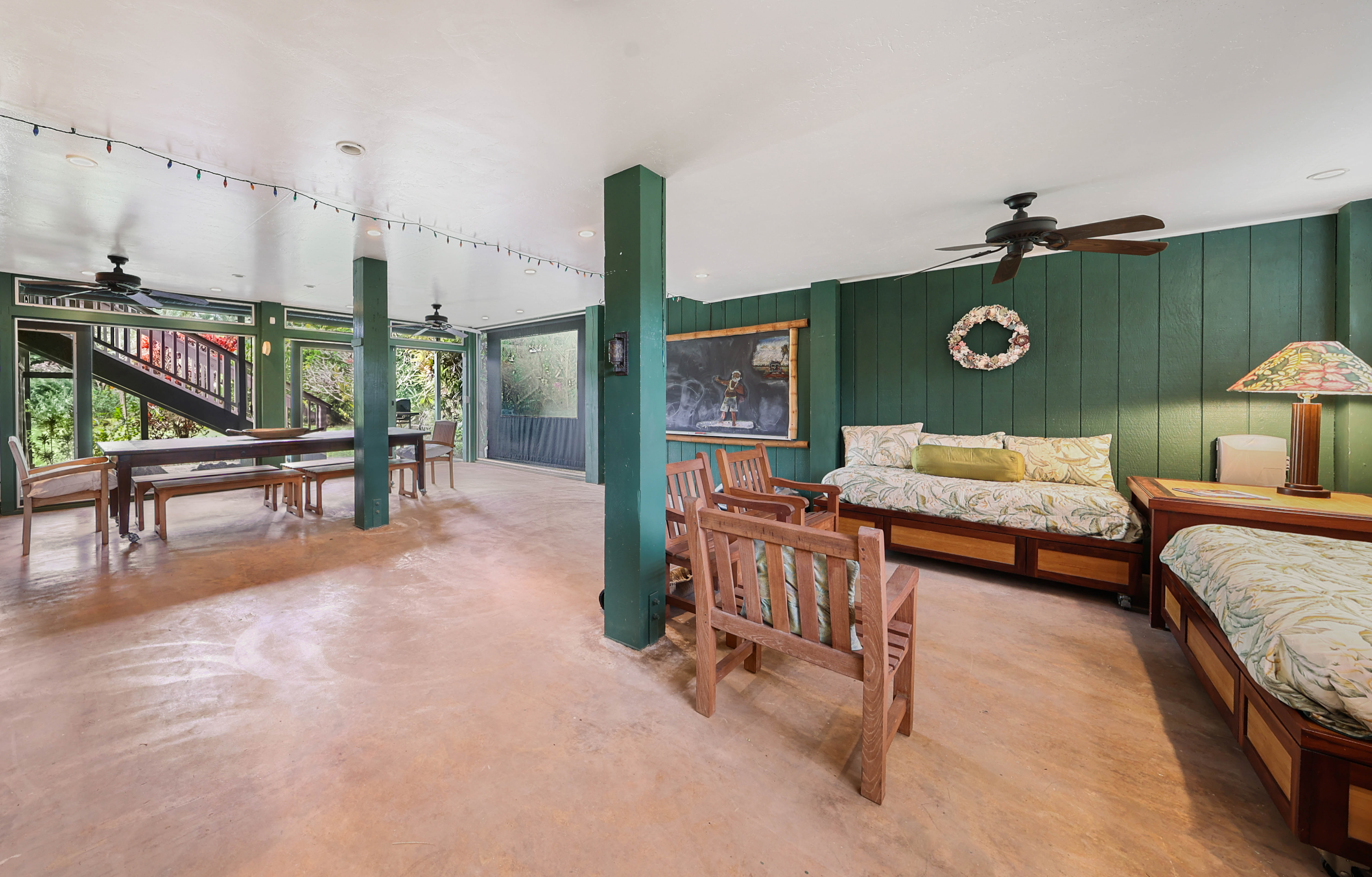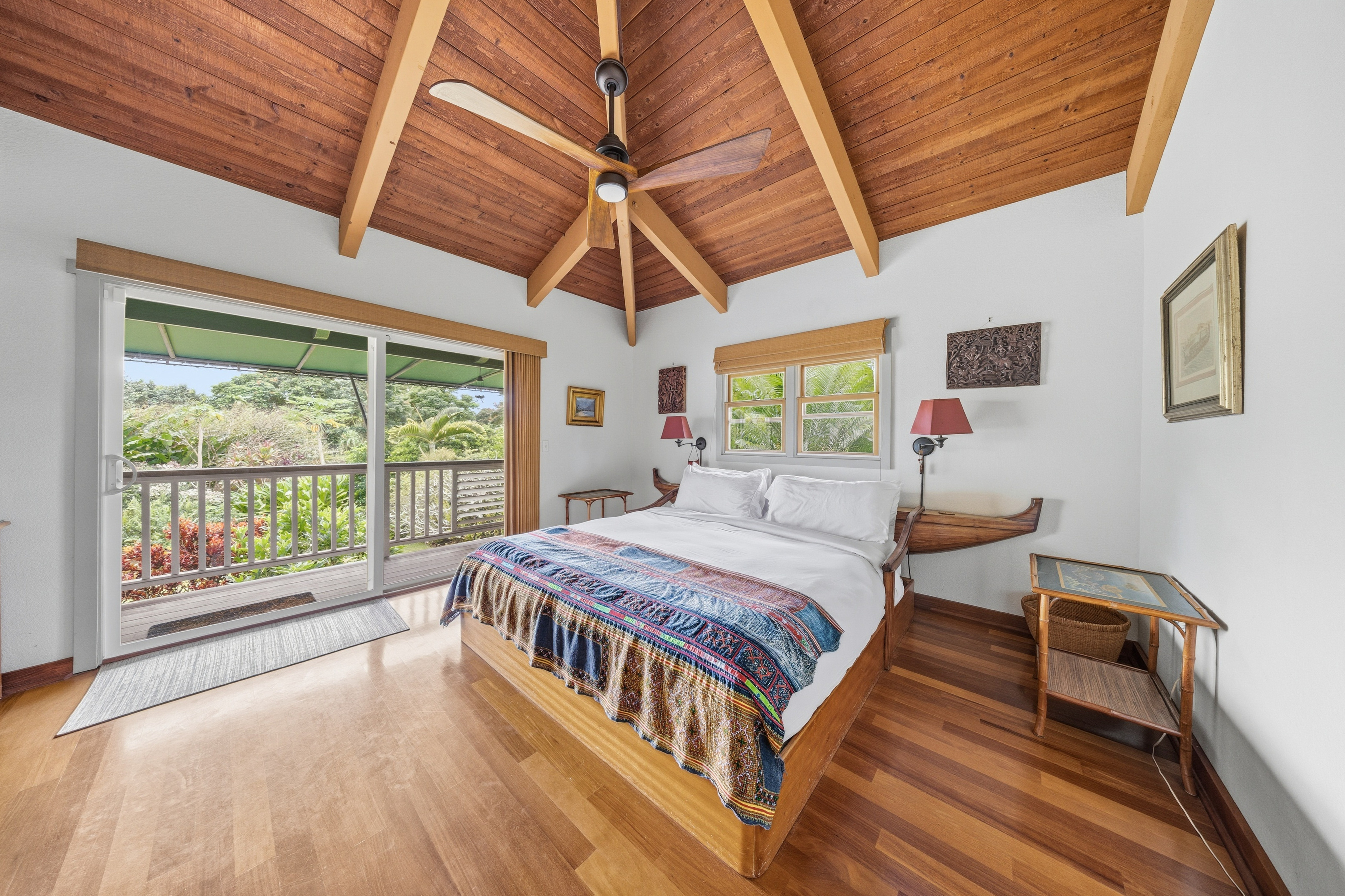 Spend your mornings enjoying coffee or a good book on the covered lanai, complete with an oversized dining table, comfortable benches, chairs, and lounge seating. On Saturdays, take a short stroll to the nearby Hanalei Farmers Market for fresh local produce and island treats.