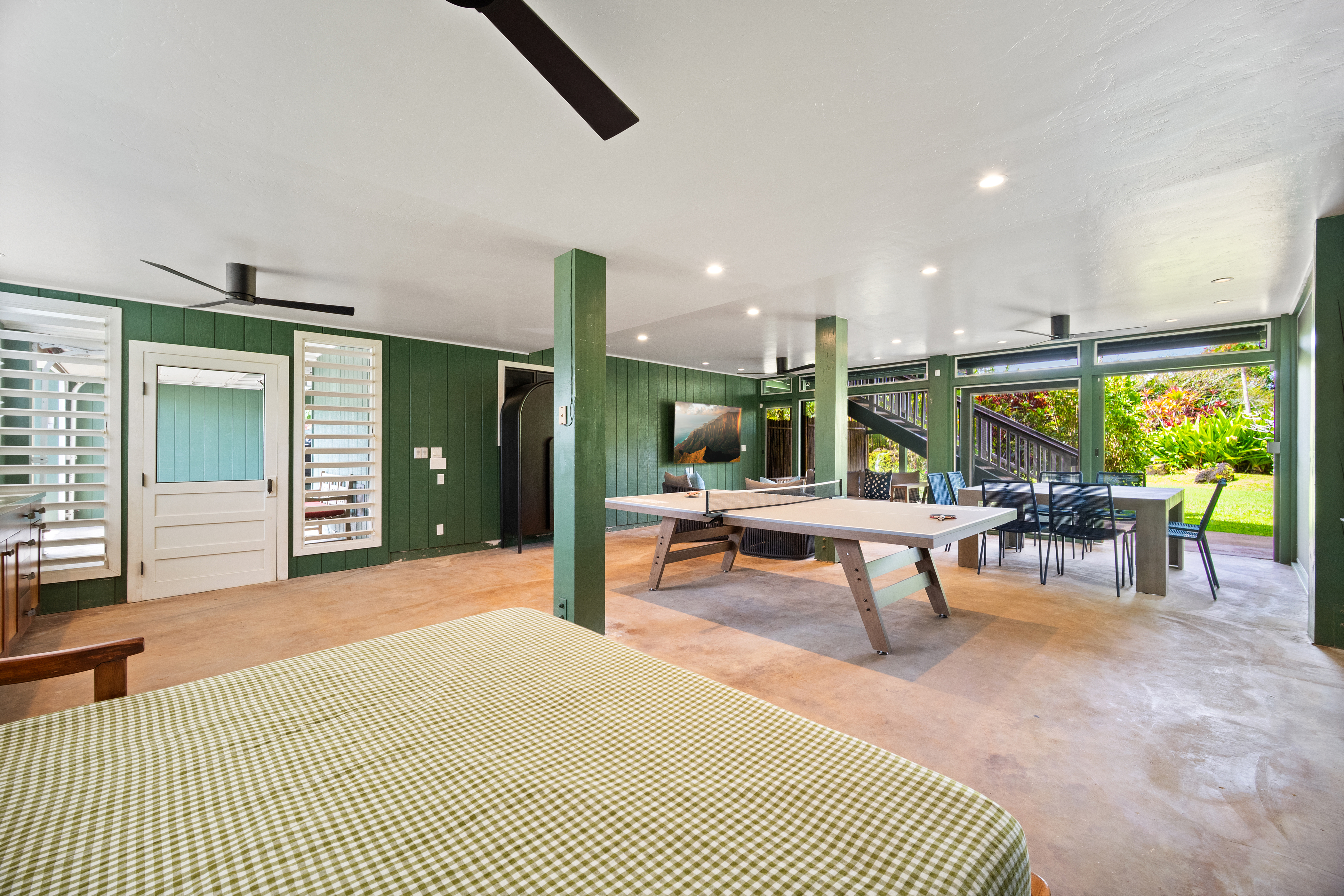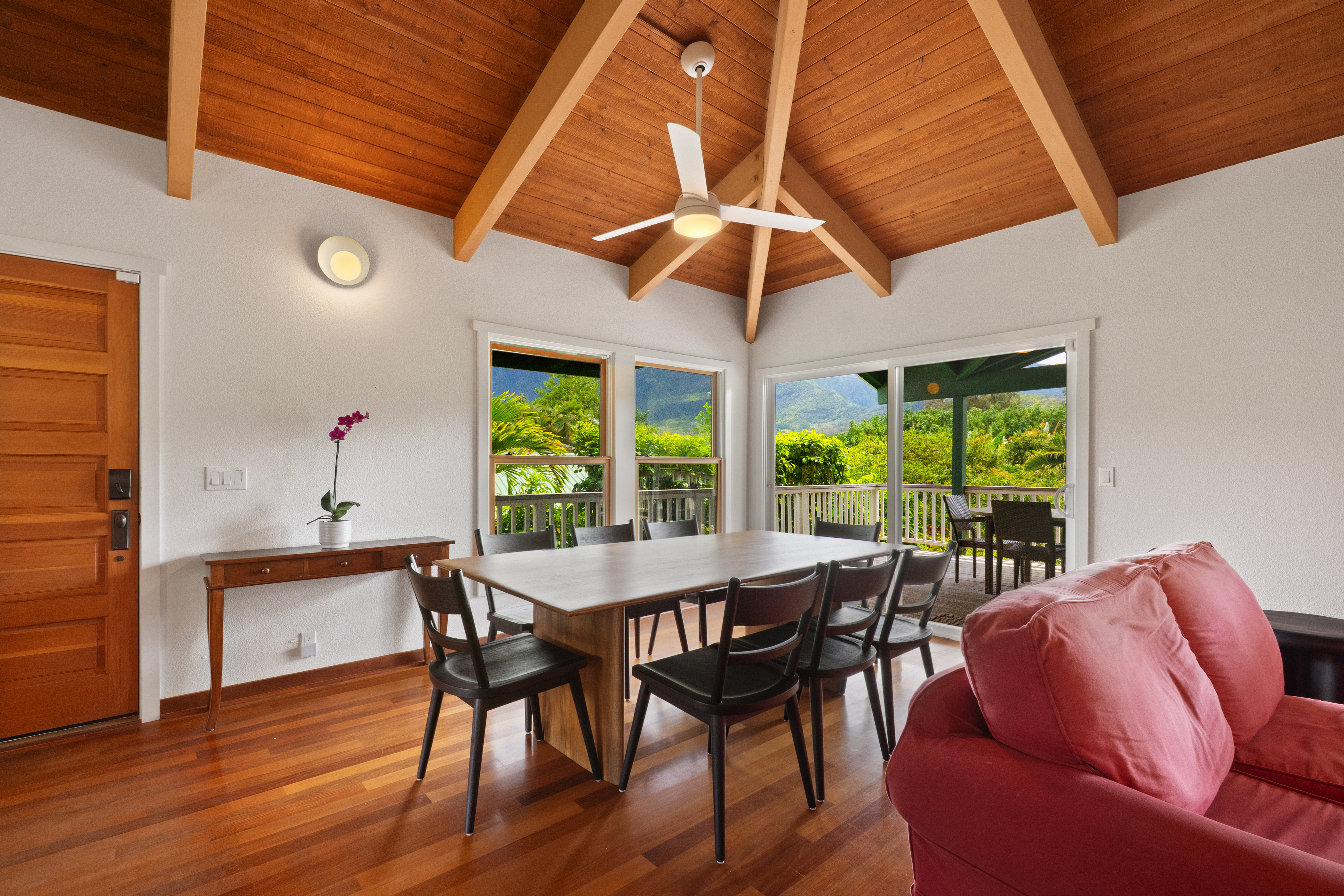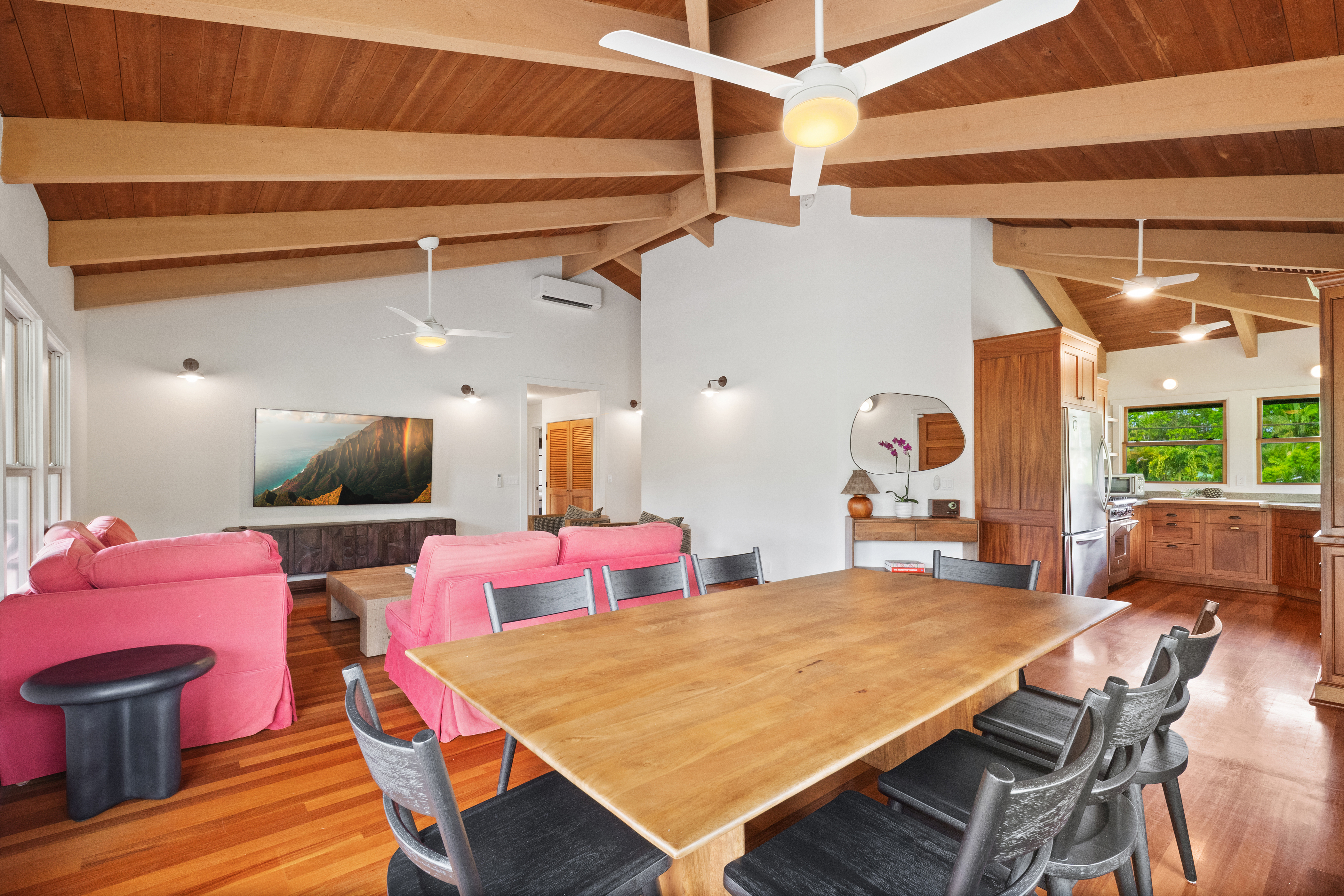 The air-conditioned living room offers generous seating, a large flat-screen Smart TV, and a comfortable layout for unwinding in style. The home’s thoughtful design provides plenty of space for guests to gather, relax, and enjoy the comforts of a beautifully appointed Hanalei vacation home.