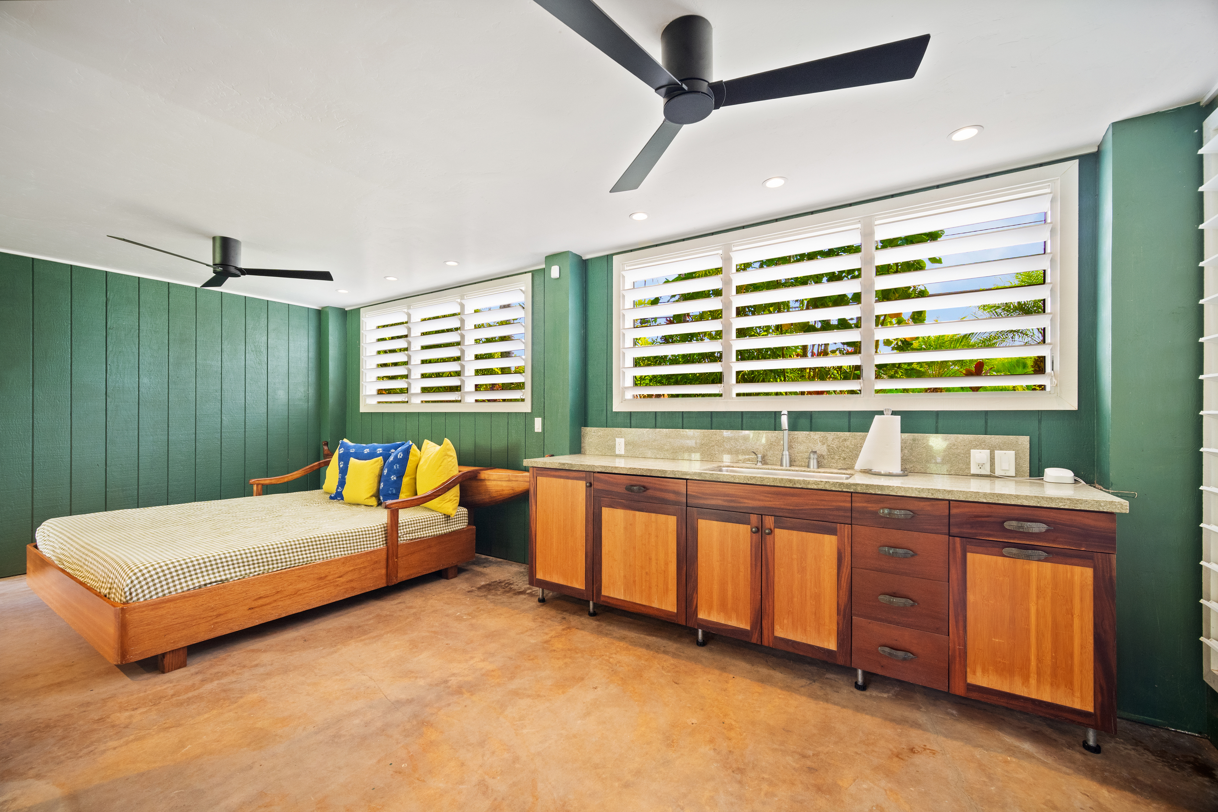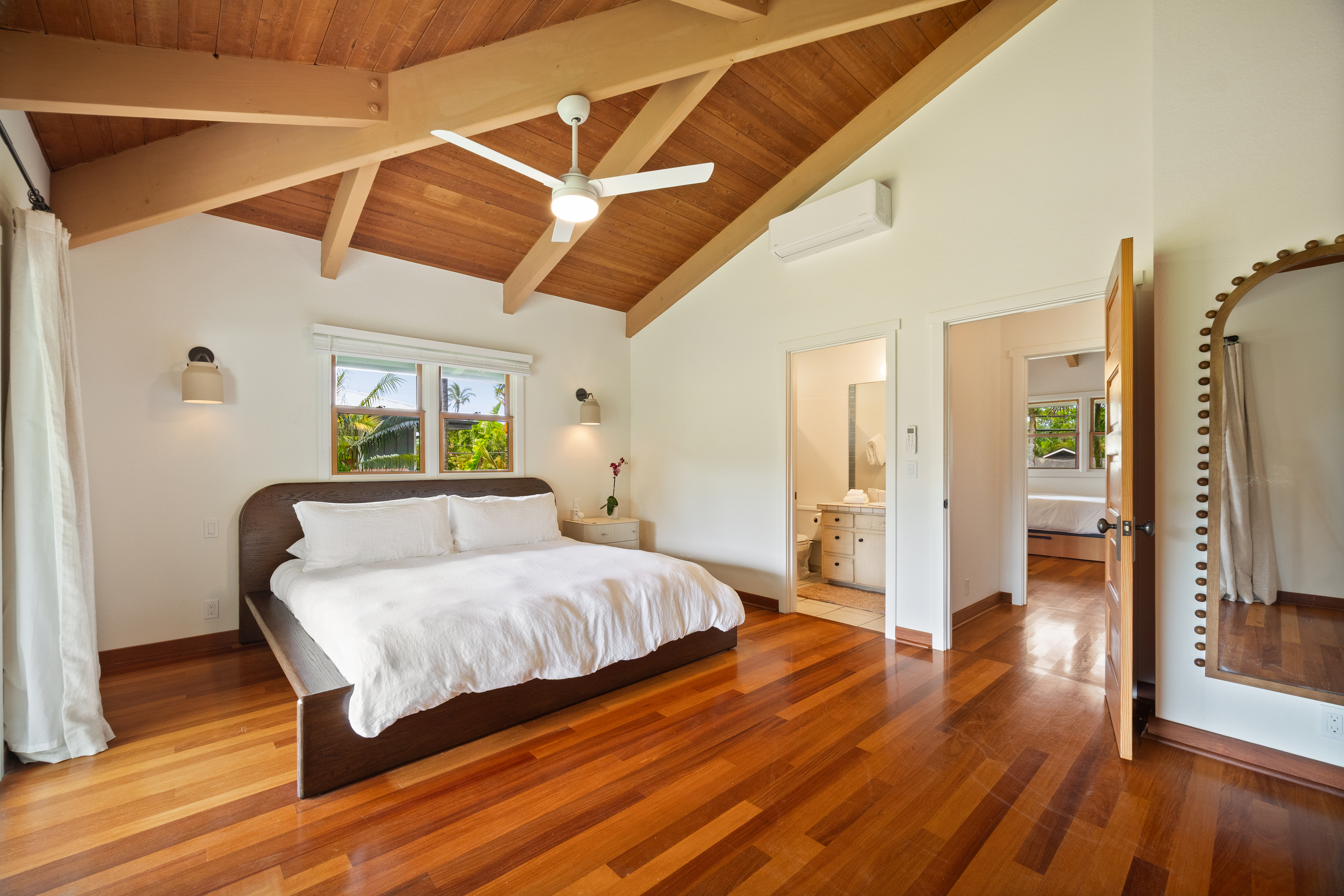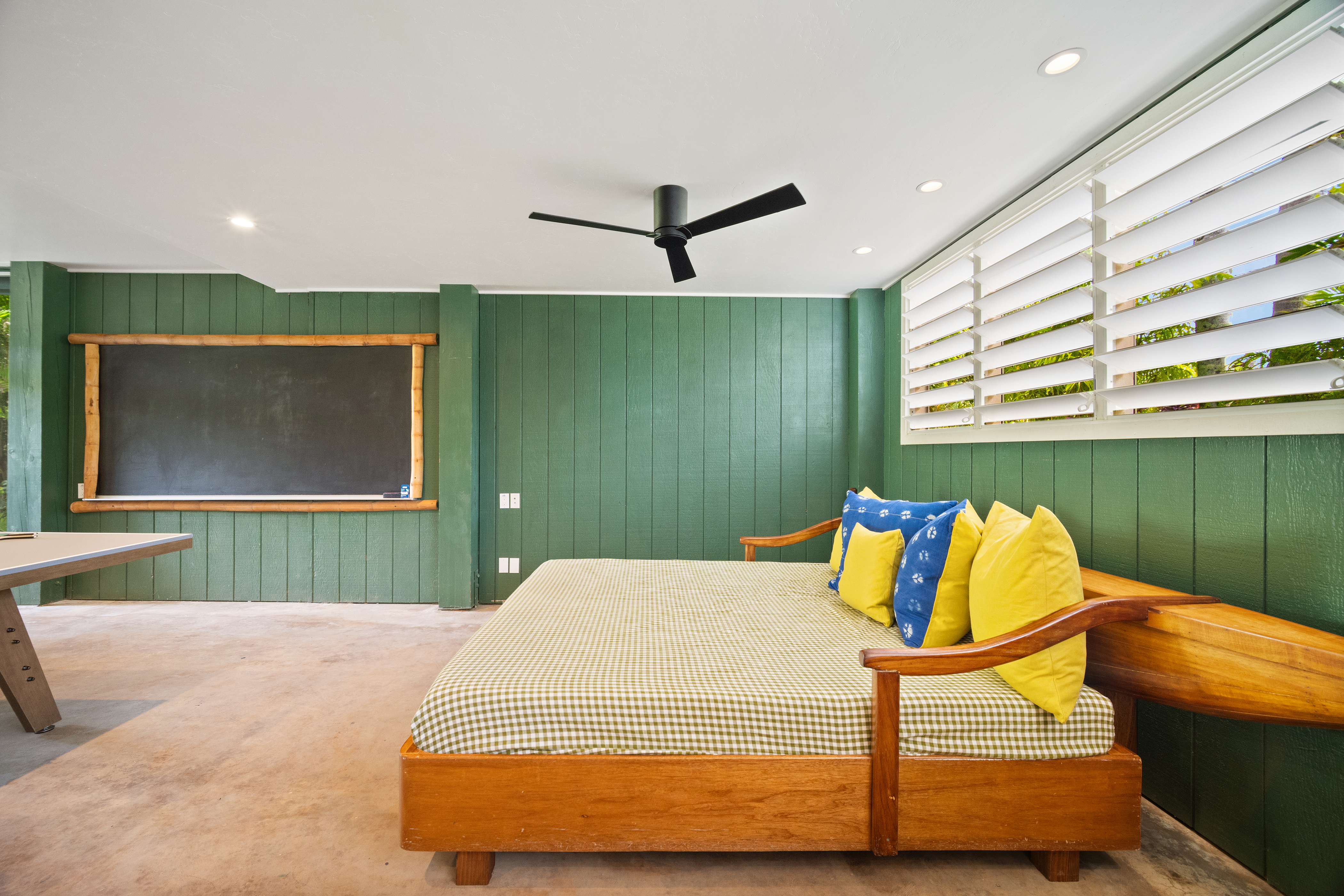 The air-conditioned living room offers generous seating, a large flat-screen Smart TV, and a comfortable layout for unwinding in style. The home’s thoughtful design provides plenty of space for guests to gather, relax, and enjoy the comforts of a beautifully appointed Hanalei vacation home.