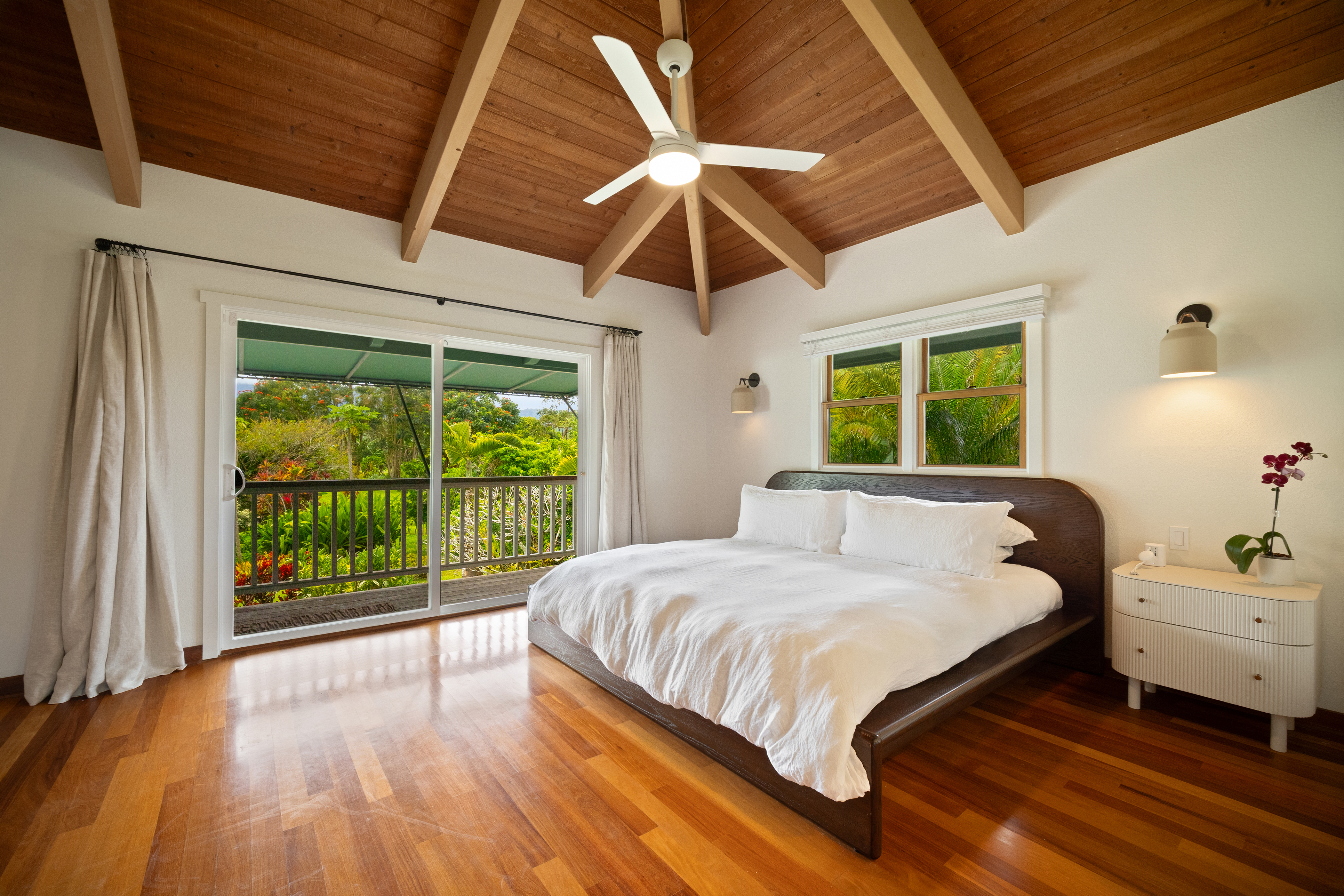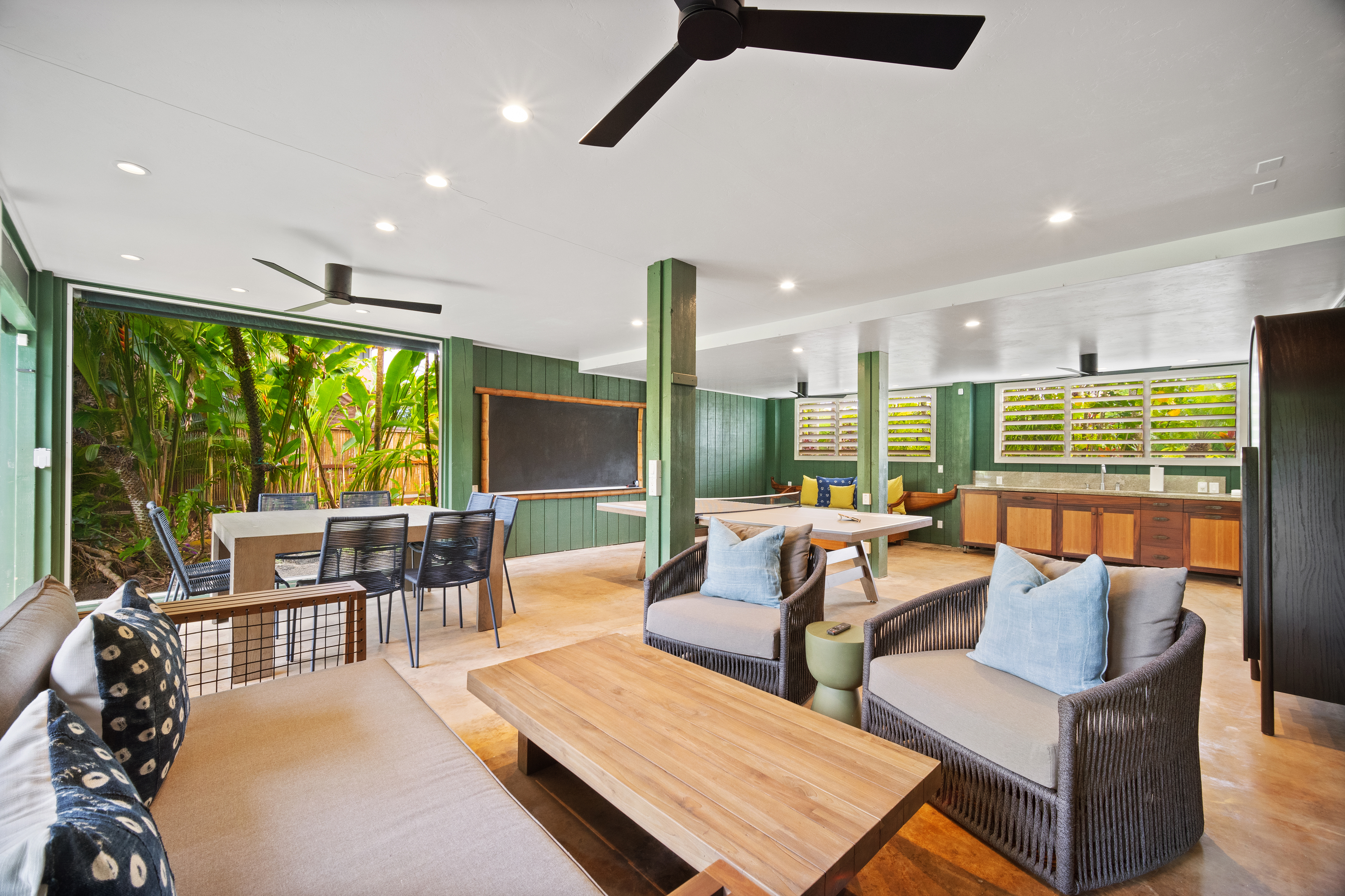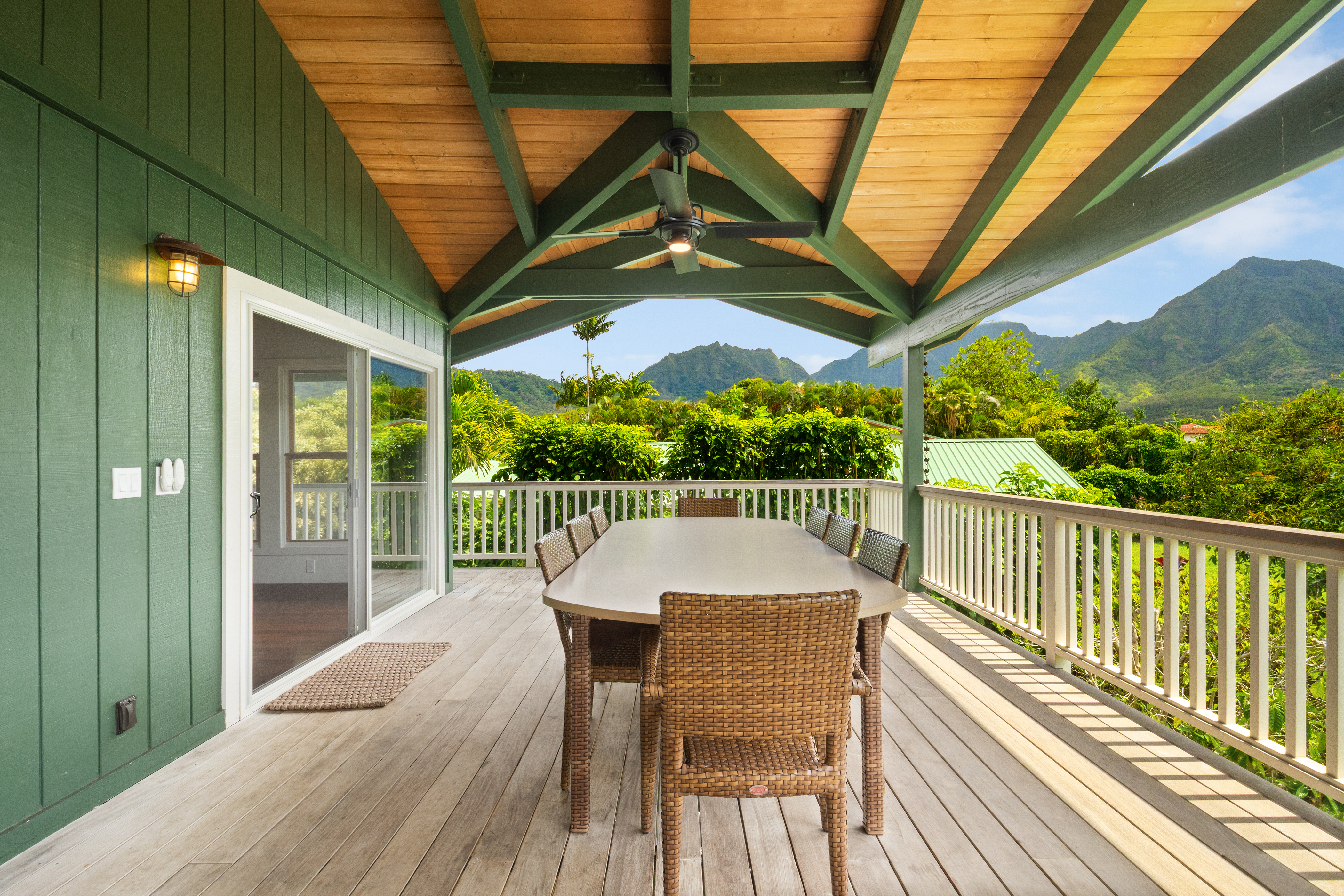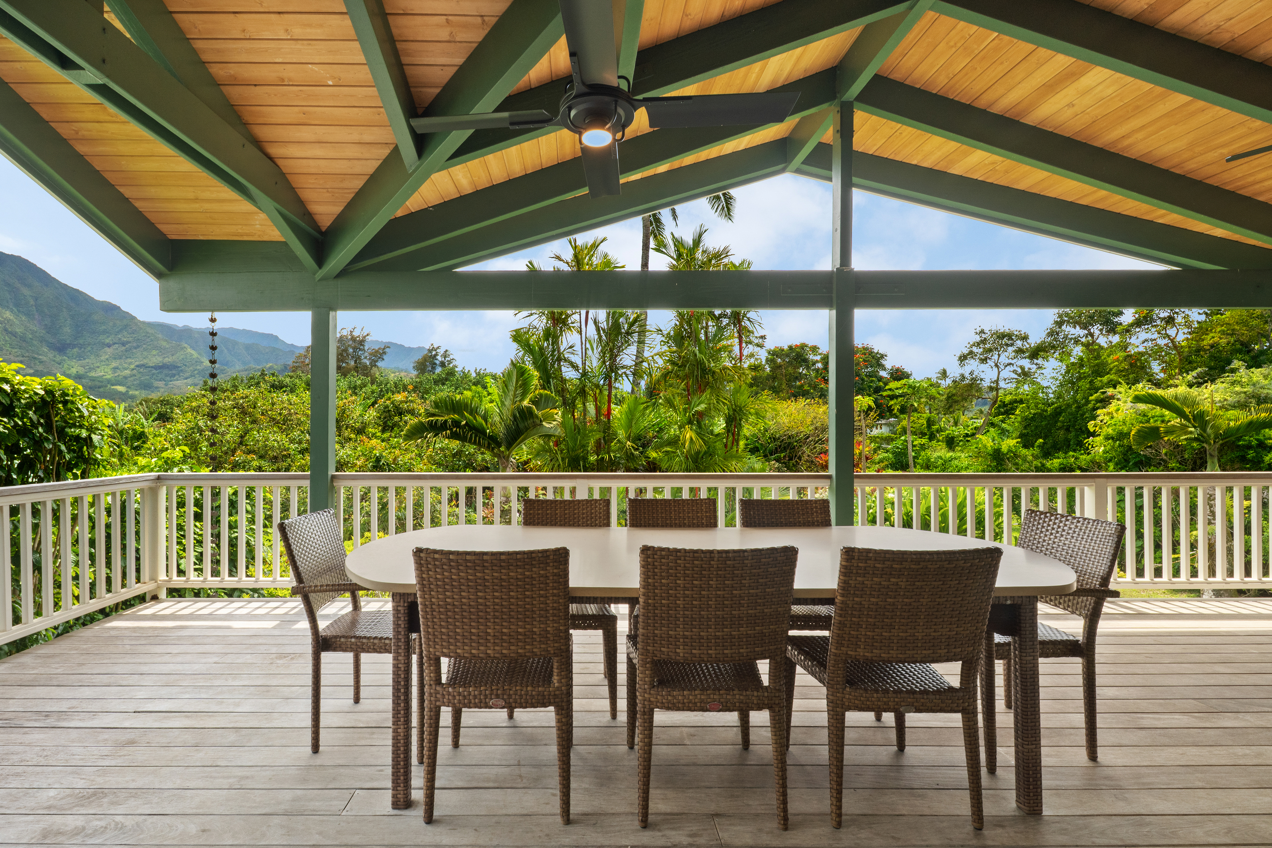 The covered lanai is designed for effortless island living, featuring an oversized dining table, comfortable bench seating, chairs, and lounge areas for relaxing after a day in the sun. Surrounded by lush tropical gardens, the outdoor spaces invite you to slow down, breathe deeply, and enjoy the natural beauty of Hanalei.