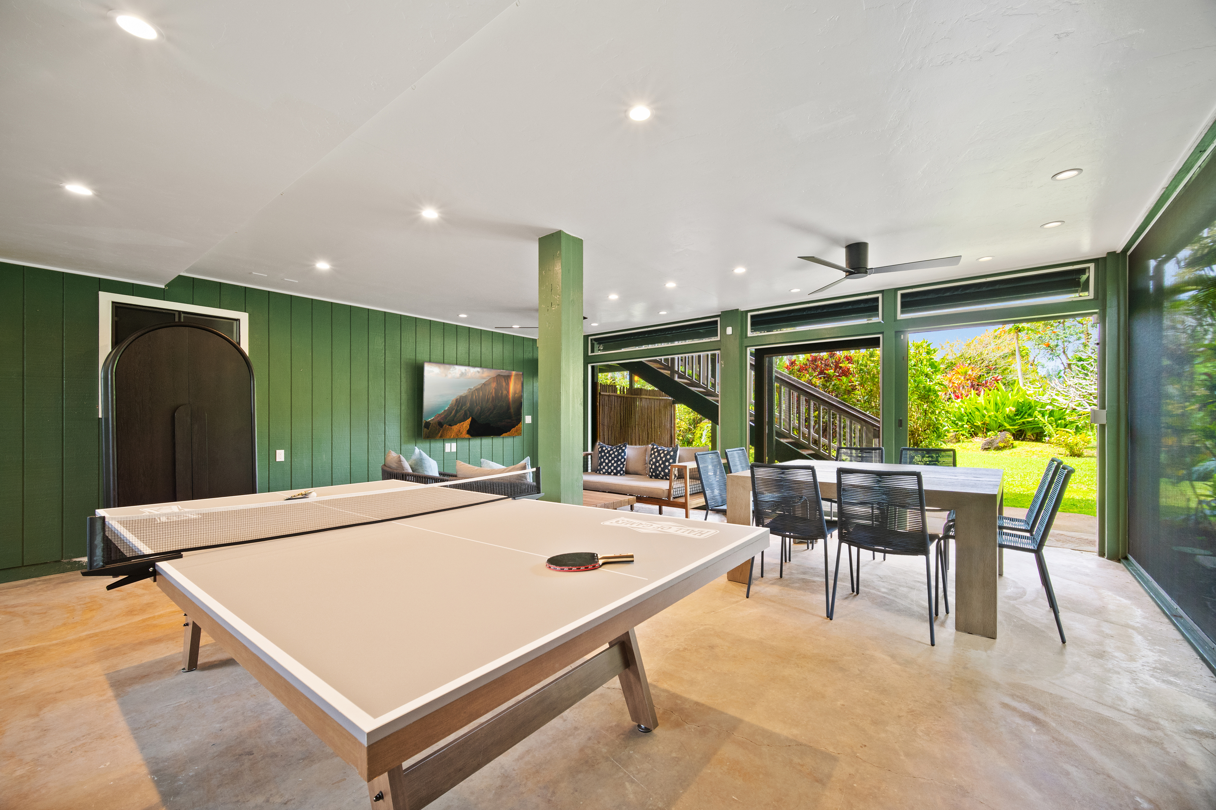 The downstairs fun room features a ping pong table and lots of s -
