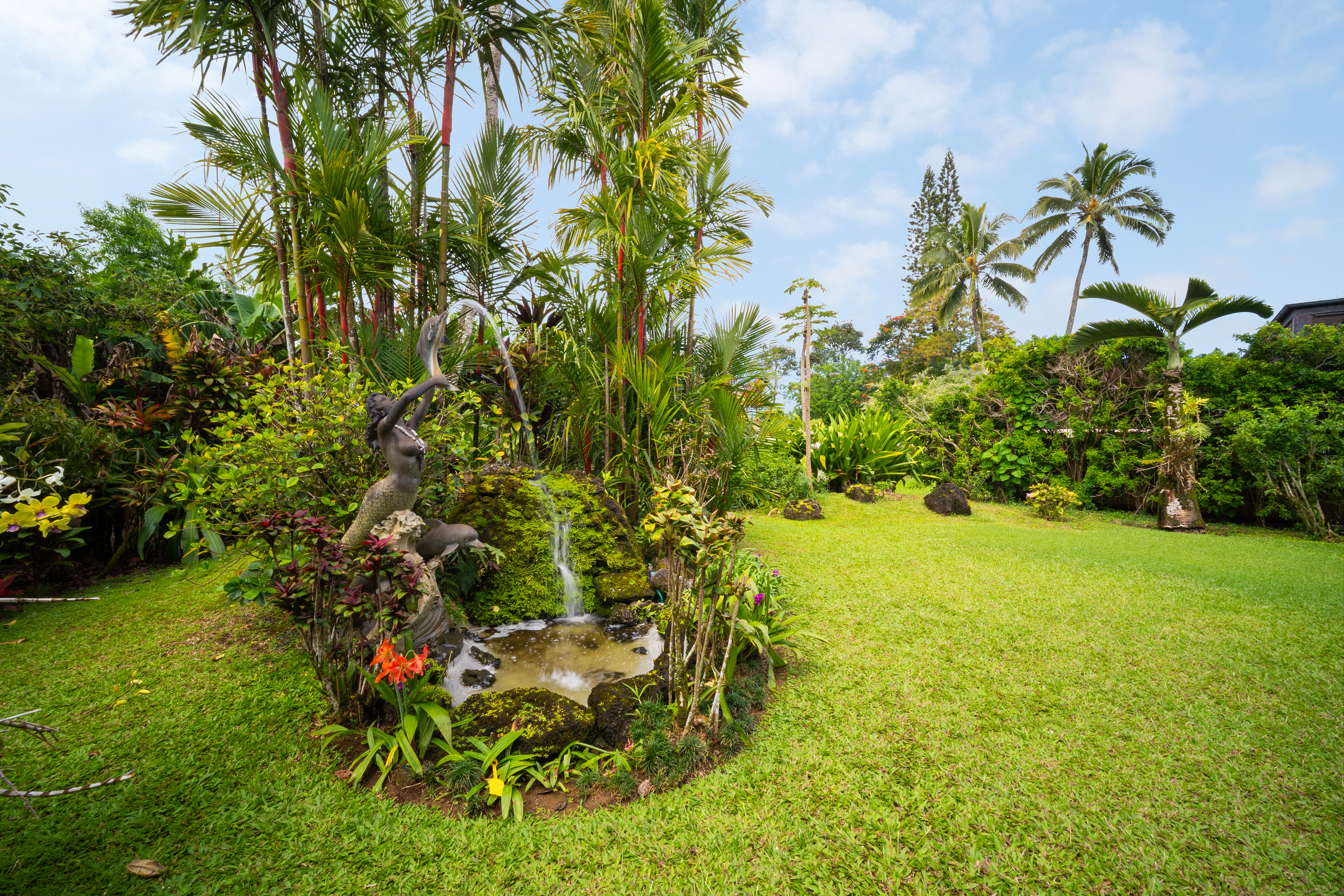 A stunning backyard featuring a water fountain -
