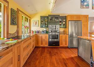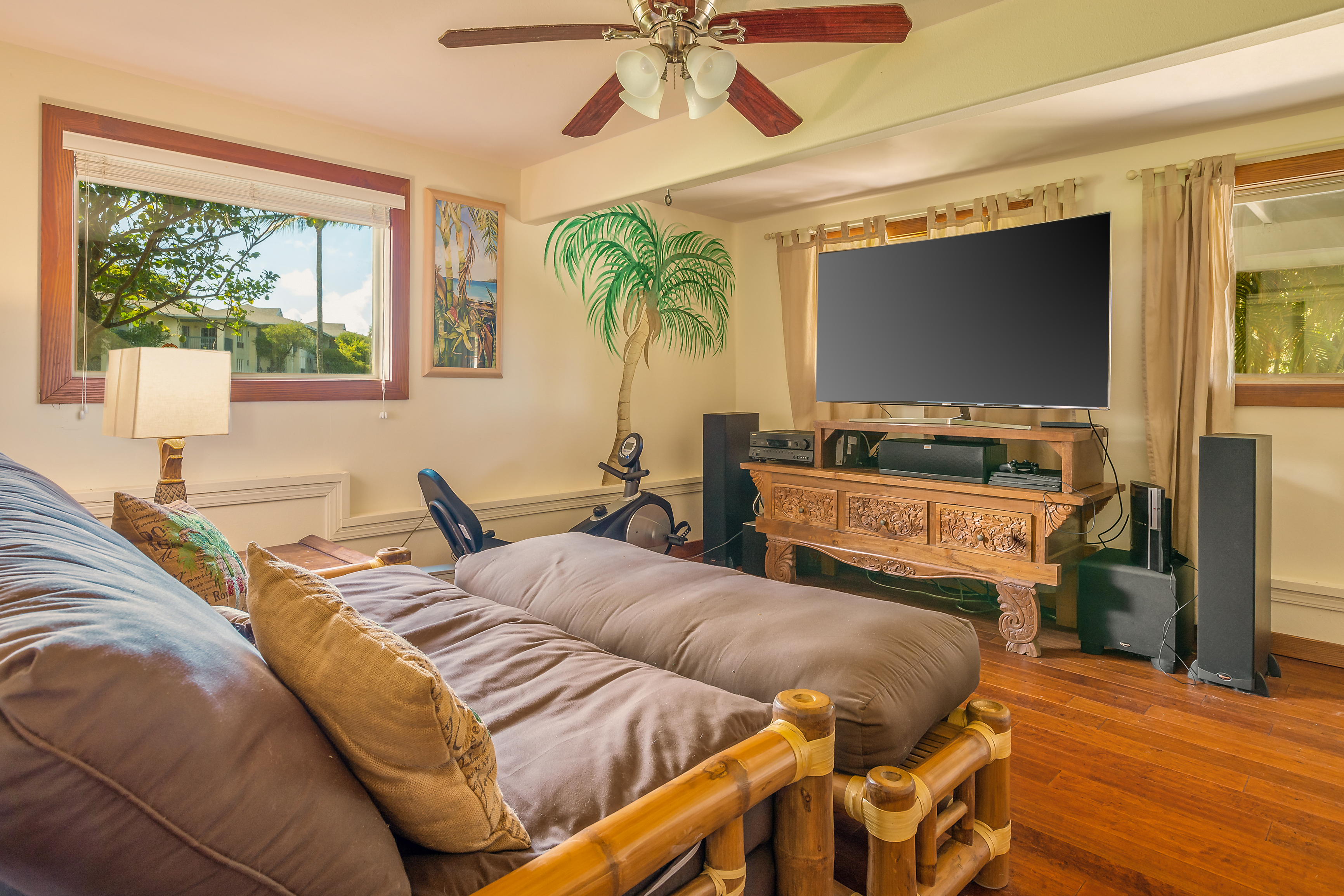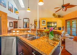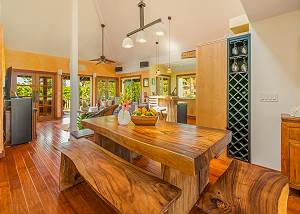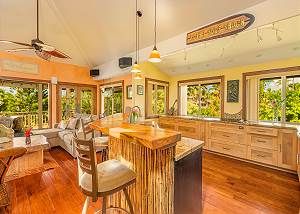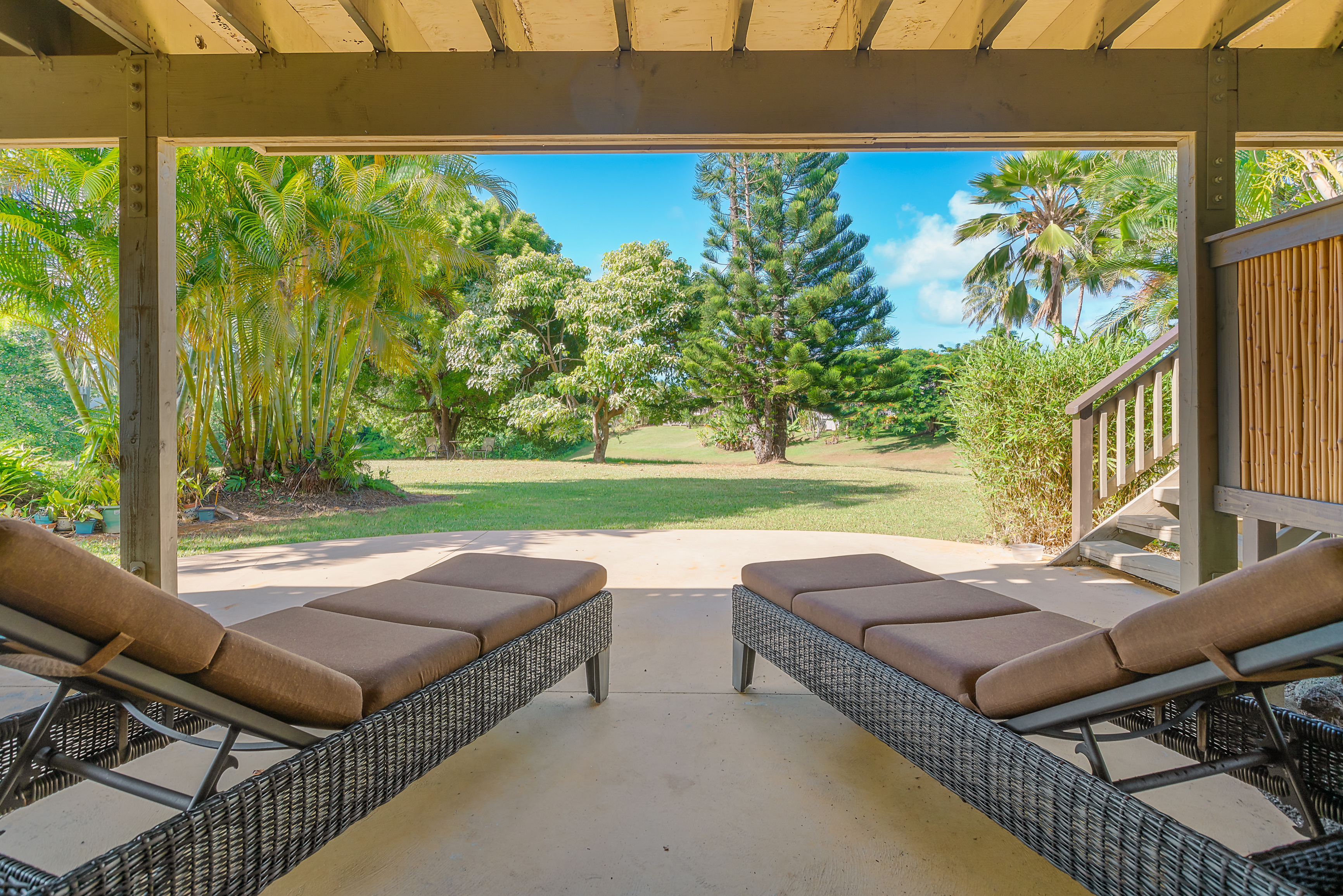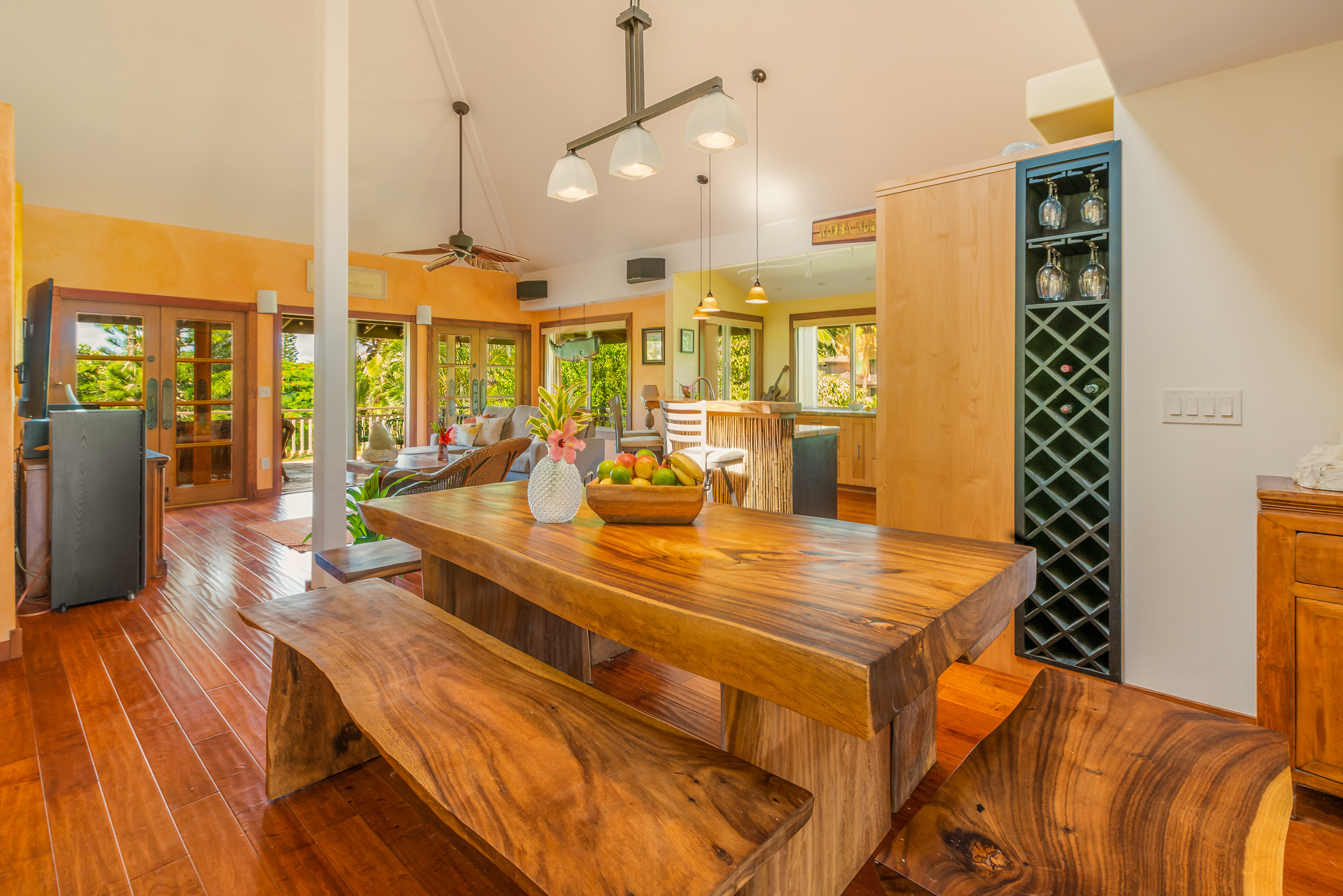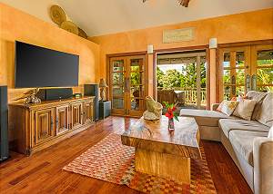 Step through the grand double-door entry and into a bright, open living space with rich hardwood floors and island-inspired décor. The fully equipped chef’s kitchen is perfect for preparing fresh local meals or hosting unforgettable dinners with friends and family. The living area leads out to a covered lanai - a space great for unwinding after a long day of adventures.