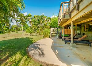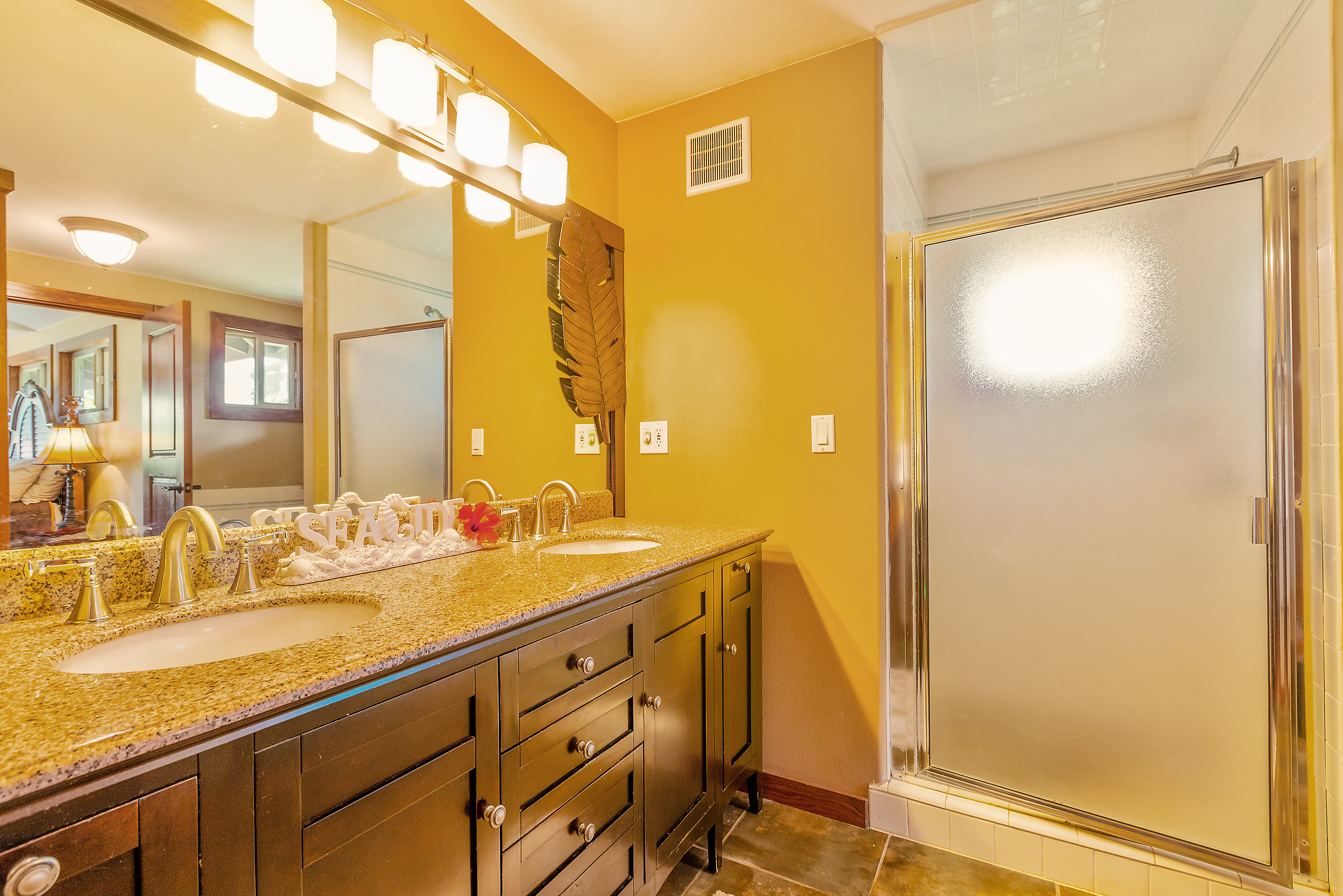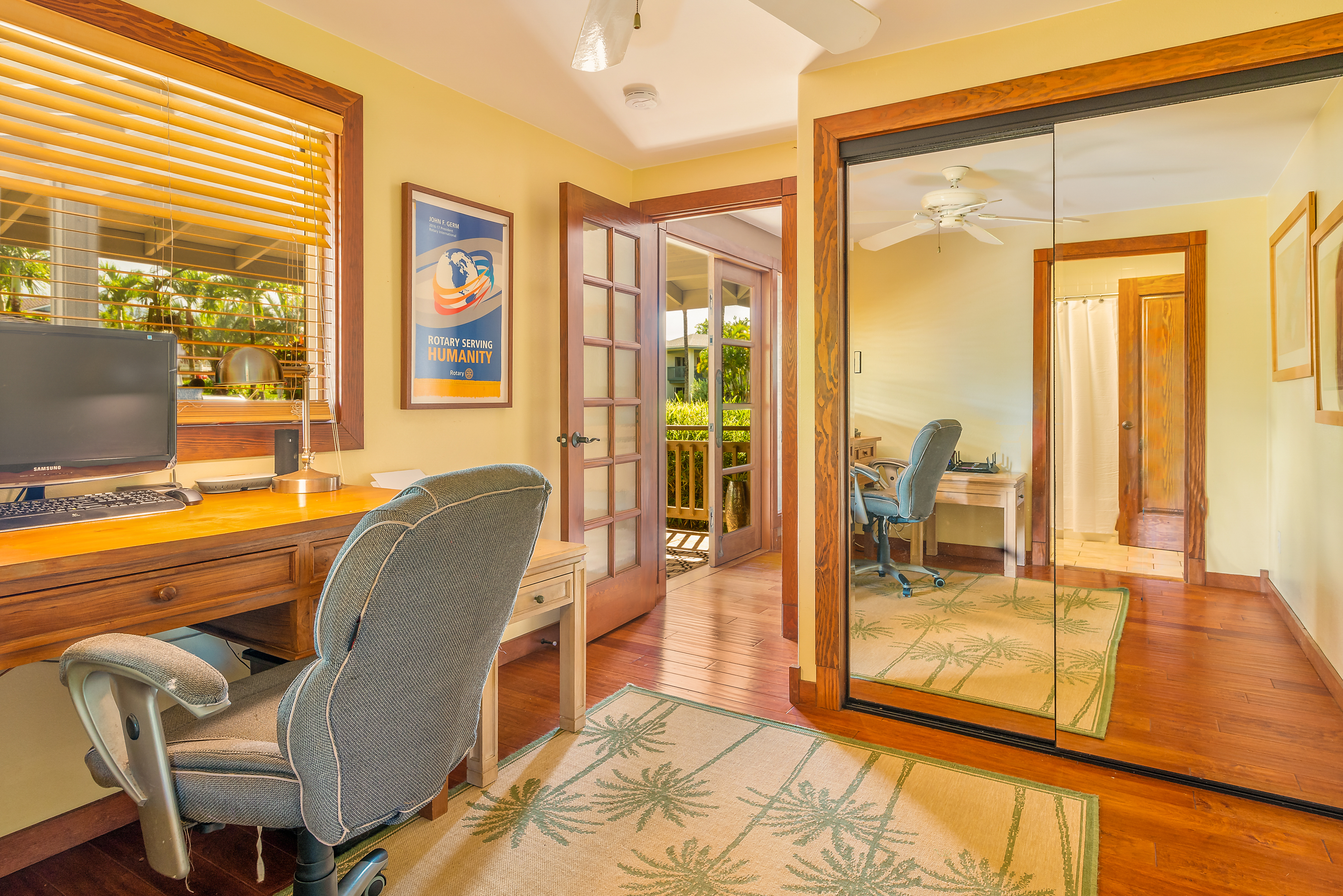 Downstairs, a separate Ohana suite with private access, ensuite bathroom and an outdoor shower offers extra space for guests—ideal for extended family or couples traveling together. Step out on the covered lanai, sit and relax as you take in the beautiful flowers and lush greenbelt.