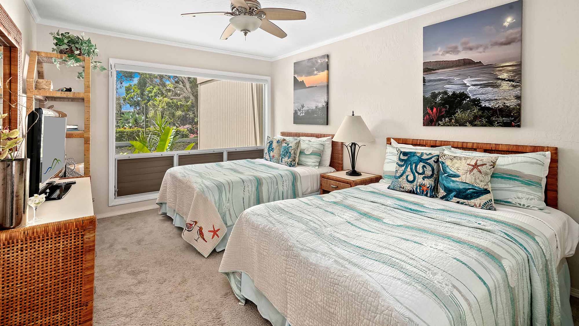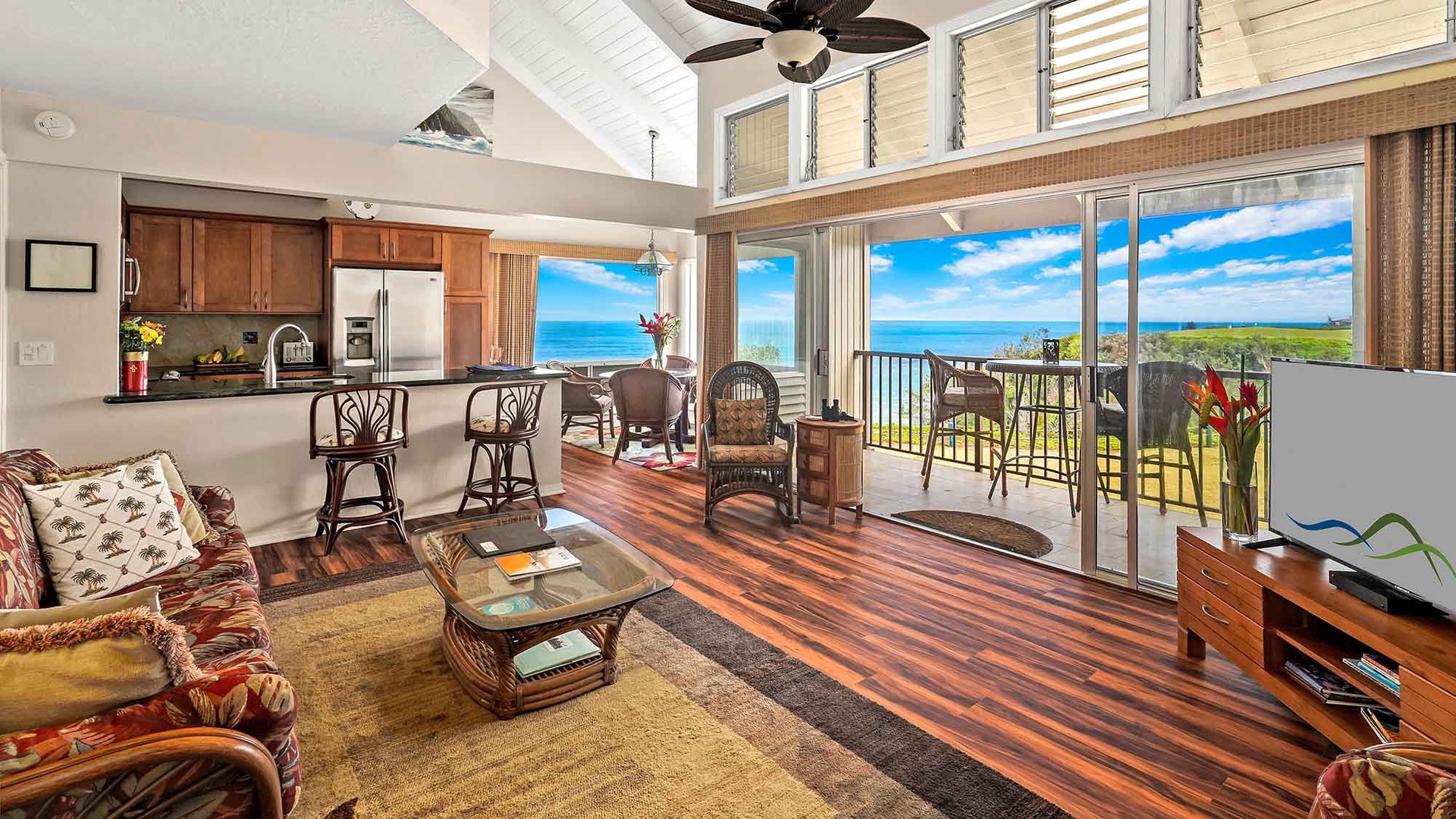 The heart of the home features a bright, open-concept living area, a fully equipped kitchen, and a refined dining space. Enjoy a covered lanai, where you can savor the gentle trade winds and admire Kauai’s world-renowned scenery. During the winter months, this vantage point serves as a front-row seat for seasonal whale watching.