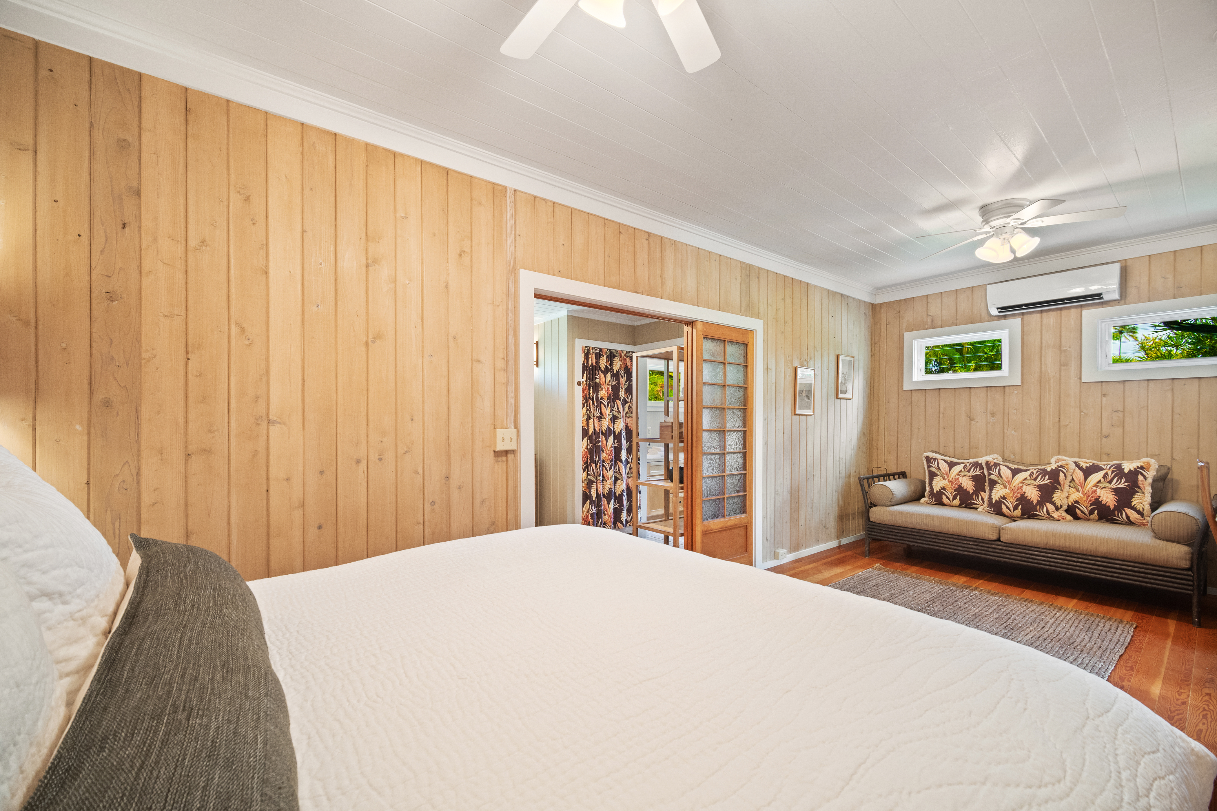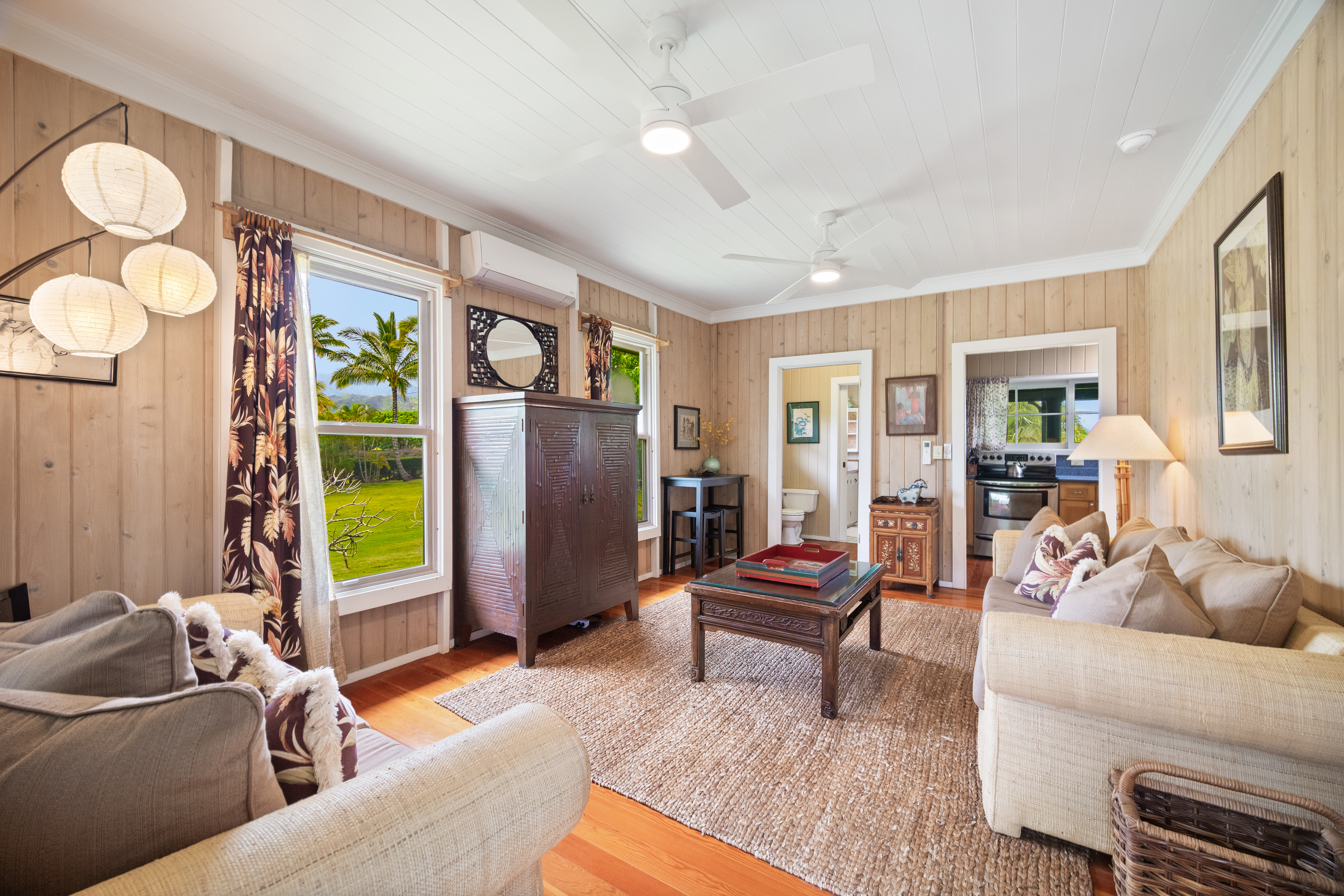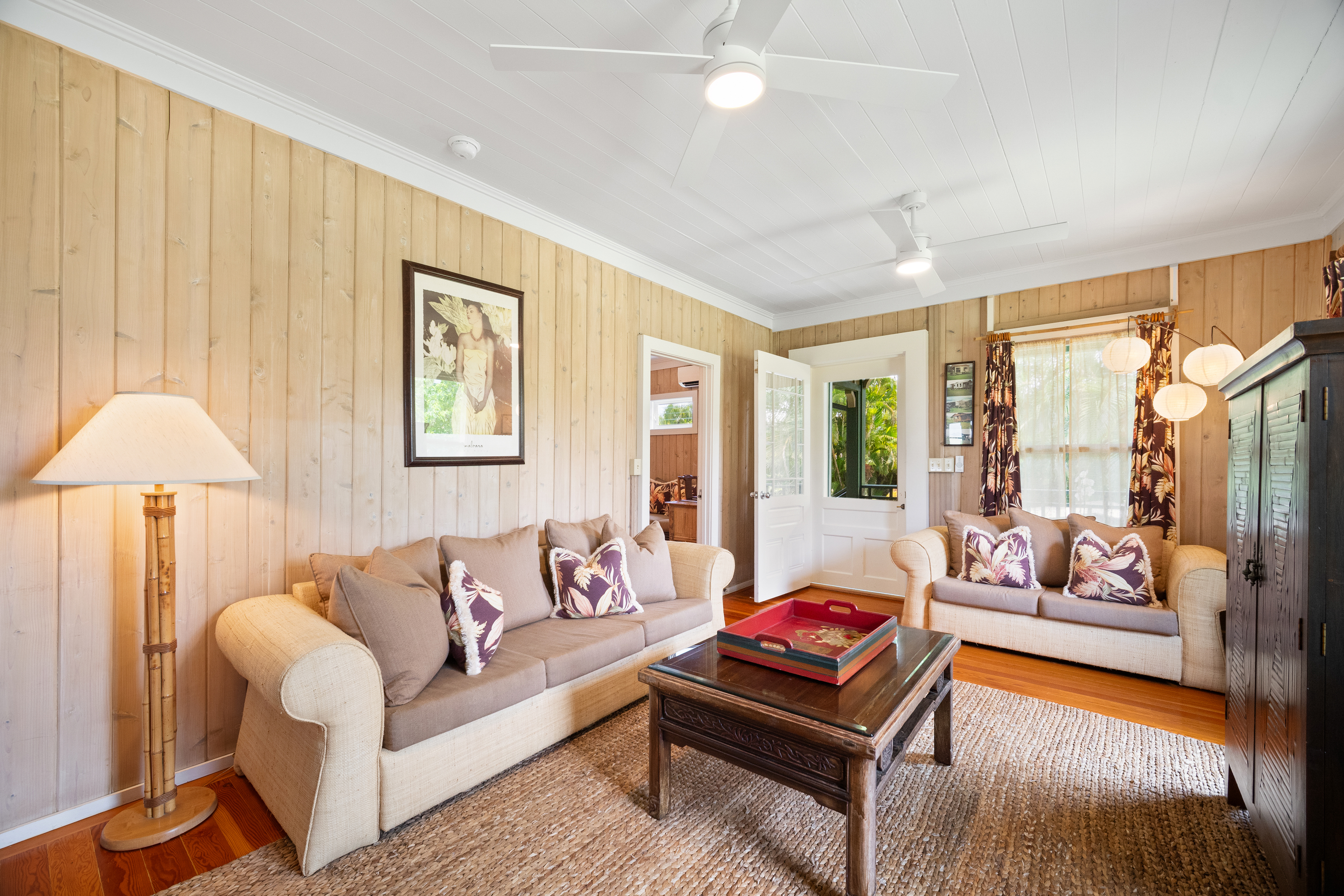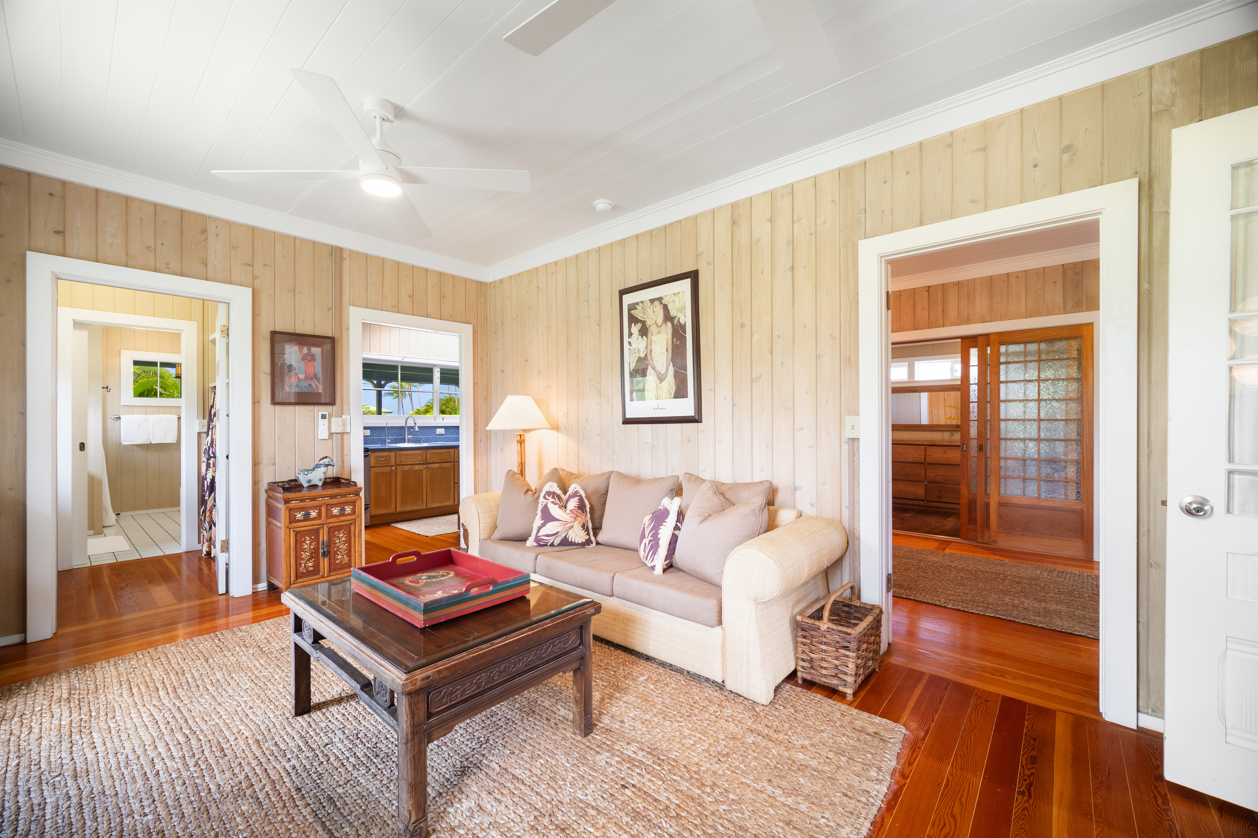 This air-conditioned beach cottage has been thoughtfully remodeled to blend the warmth of traditional plantation-style architecture with the comfort of modern living. Every detail evokes the spirit of Old Hawai'i—open beam ceilings, natural wood finishes, and breezy lanais that invite the outdoors in.