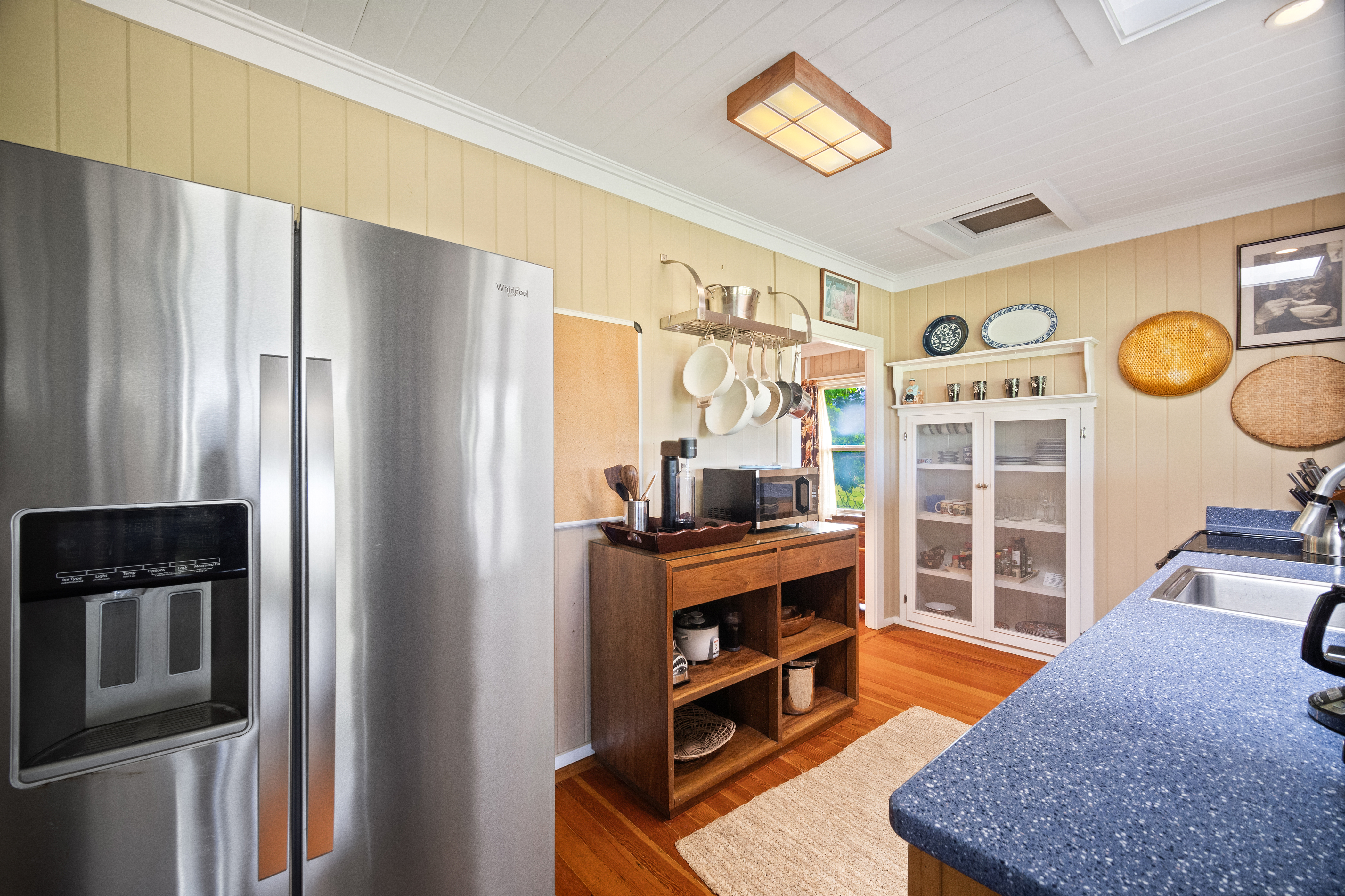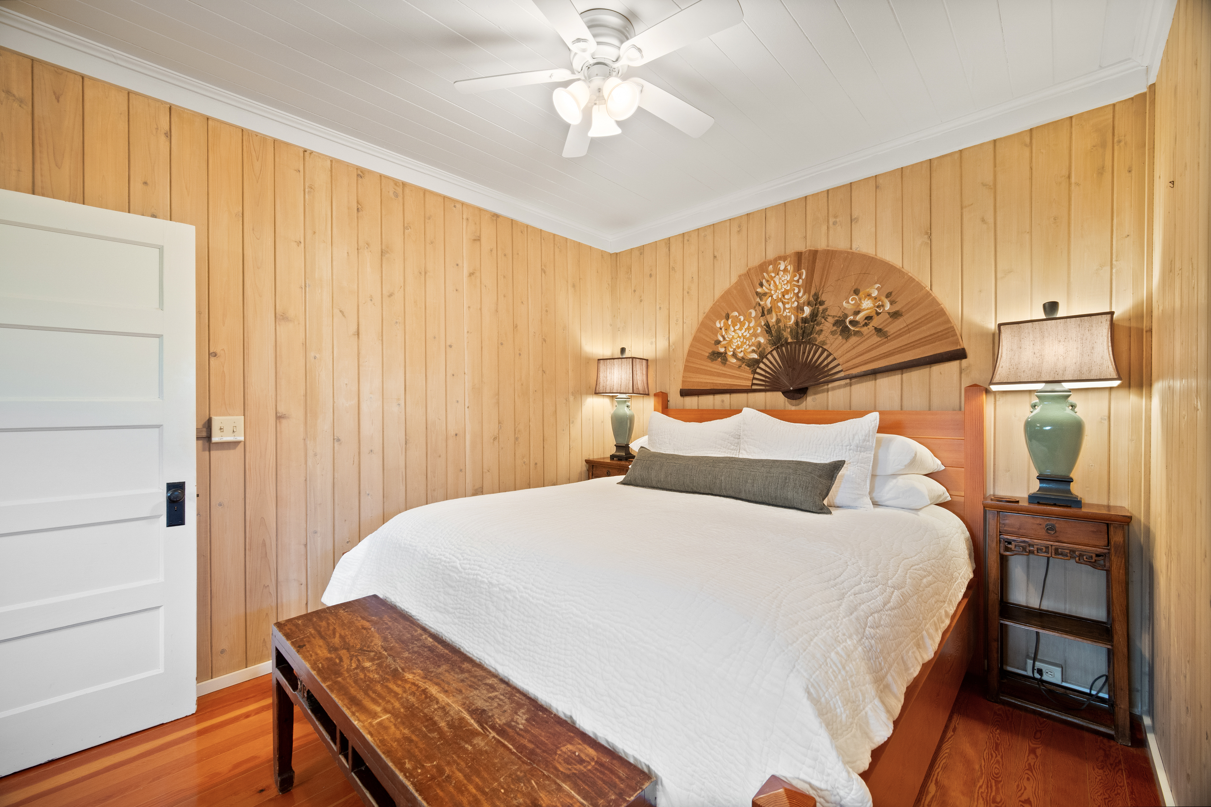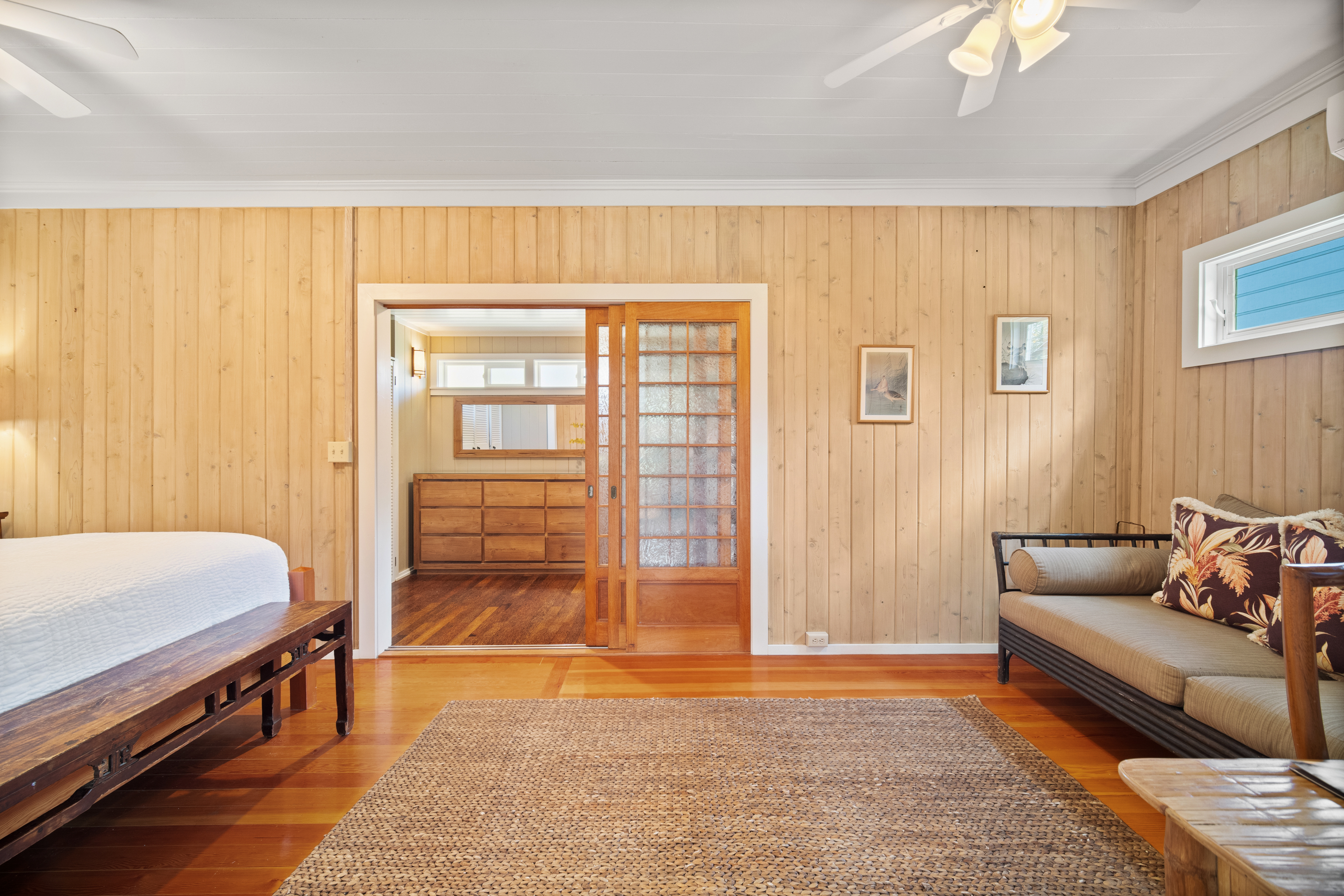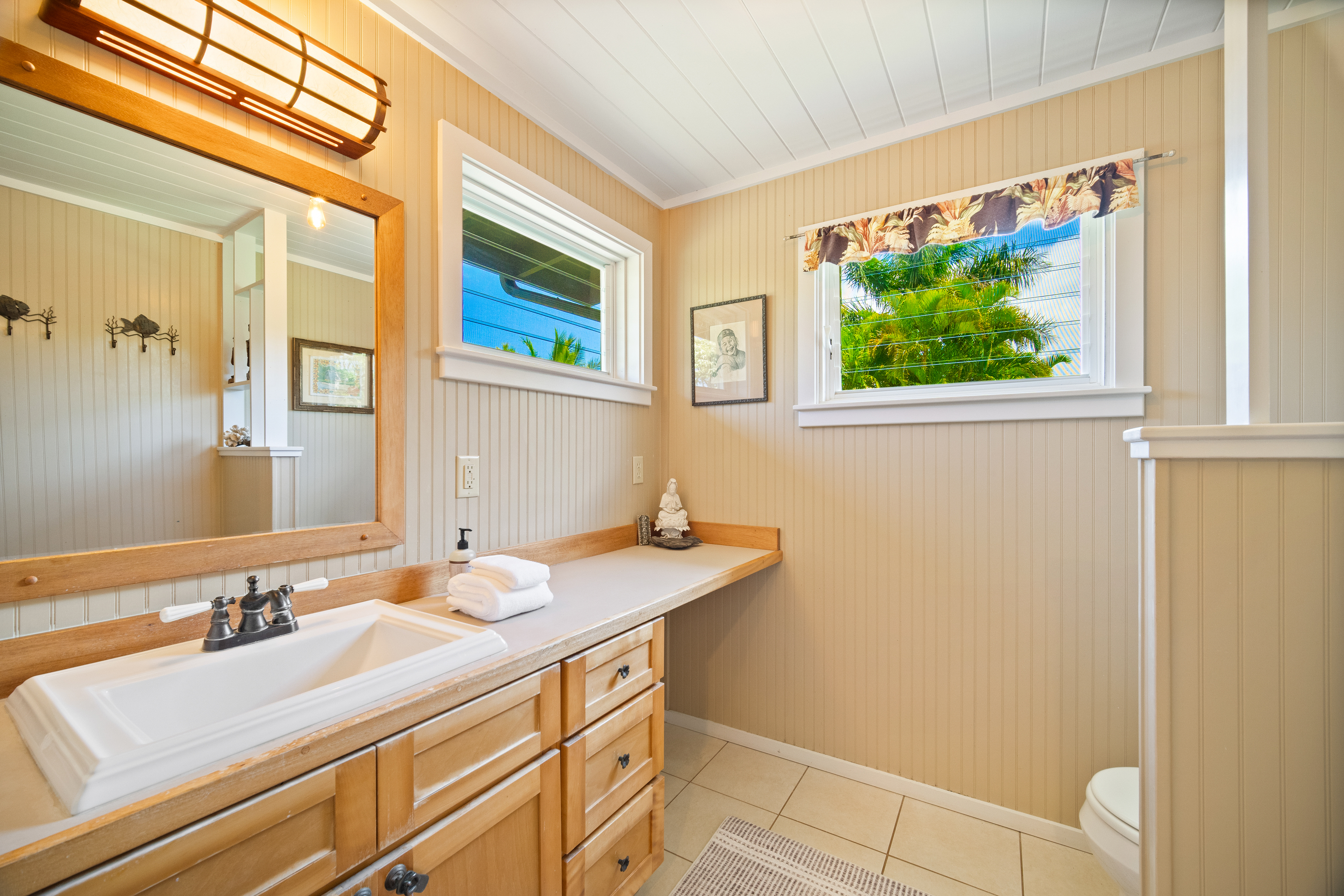 This air-conditioned beach cottage has been thoughtfully remodeled to blend the warmth of traditional plantation-style architecture with the comfort of modern living. Every detail evokes the spirit of Old Hawai'i—open beam ceilings, natural wood finishes, and breezy lanais that invite the outdoors in.